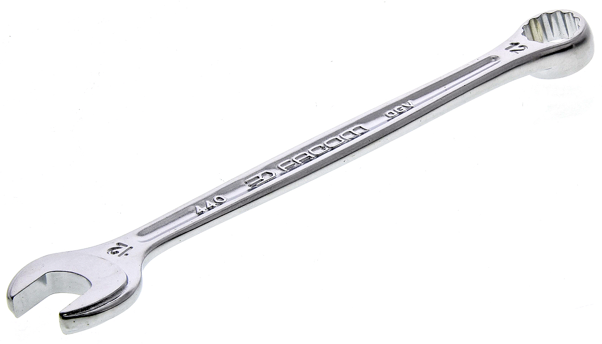 Series 440 combination spanners Series of standard combination spanners with 15° angle Variable handle cross-section provides better grip and stability for added comfort Improved accessibility thanks to unobstructed view Optimised open-end / handle geometry for greater accessibility Satin chrome finish 12-point OGV profile for a high torque without damaging the nut 6 point ring available on 476-040 and 476-050