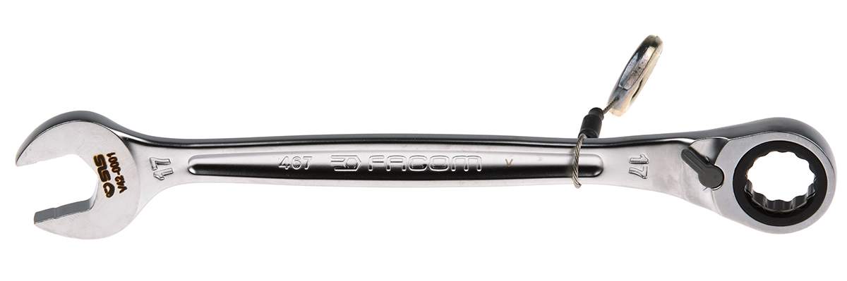 This is 17 mm Hexagon SLS Height Safe Combination Ratchet Spanner Reversible 225 mm Length manufactured by Facom. The manufacturer part number is 467.17SLS. It is available in metric package. A quality product with a nice satin chrome finish. Furthermore, it has a/an combination ratchet spanner type spanner . It has an overall length of 225 mm. It is height safe yes . It is double ended yes . Its metric size is approximately 17mm . The product is available in 17 mm size.