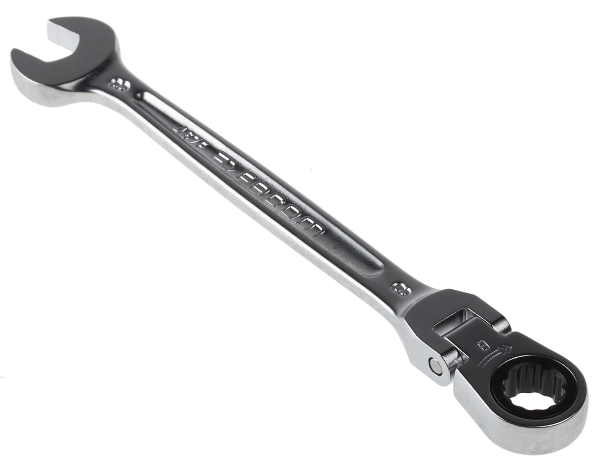This is 8 mm Combination Ratchet Spanner 127 mm Length 467F.8 manufactured by Facom. The manufacturer part number is 467BF.8. It is available in metric package. A quality product with a nice satin chrome finish. Furthermore, it has a/an flex head ratchet spanner type spanner . It has an overall length of 127 mm. It is double ended yes . Its metric size is approximately 8mm . The product is available in 8 mm size.