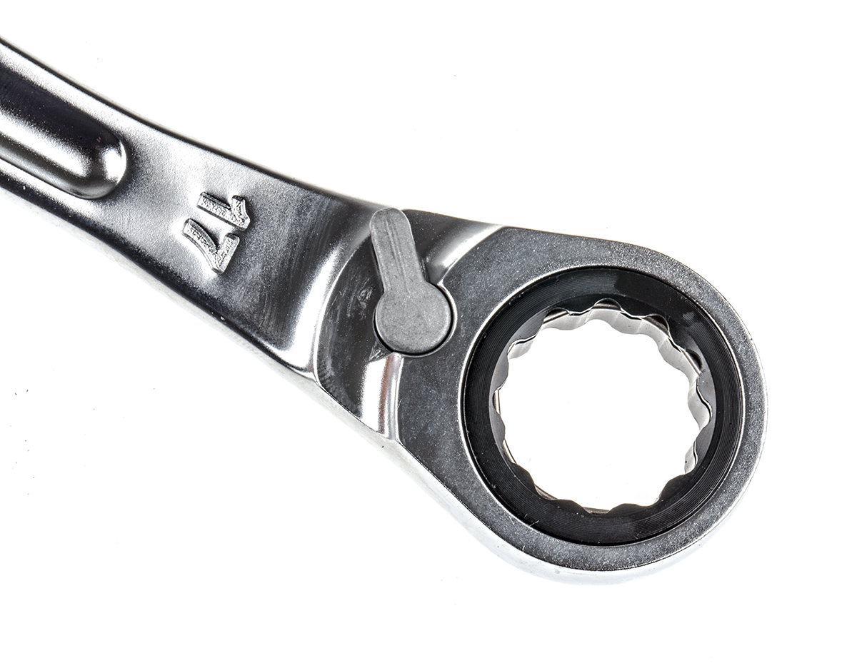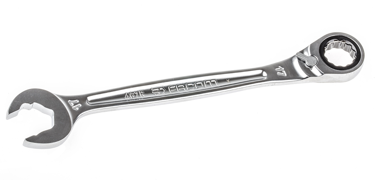 This is 17 mm Combination Ratchet Spanner manufactured by Facom. The manufacturer part number is 467BR.17. It is available in metric package. A quality product with a nice satin chrome finish. The product 467br, is a highly preferred choice for users. The product is made from highly stable and reliable chrome vanadium steel. It has an overall length of 225 mm. Furthermore, it has a/an combination ratchet spanner type spanner . Ratcheting Options - yes. It is double ended yes . Its metric size is approximately 17mm .