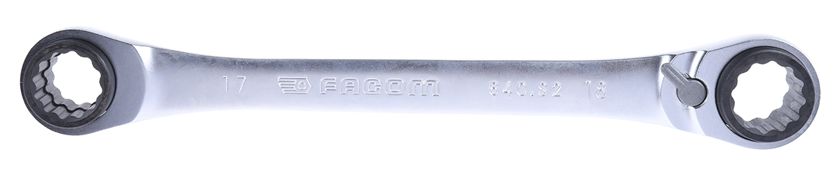 This is CLE POLY CLIQ - 16X17X18X19 manufactured by Facom. The manufacturer part number is 64C.S2. It is available in metric package. A quality product with a nice satin chrome finish. The product 64c, is a highly preferred choice for users. The product is made from highly stable and reliable chrome vandium steel. It has an overall length of 230 mm. Furthermore, it has a/an double box-end ratchet wrench type spanner . Ratcheting Options - yes. It is double ended yes . Its metric size is approximately 16 x 17 mm, 18 x 19mm .
