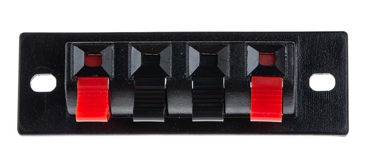 This is Panel Mount Speaker Terminal Socket 4 Way 3A Quick Connect Termination manufactured by RS Pro. The manufacturer part number is 392-683. The product has a current rating of 3a. The product is available in panel mount configuration. In addition, female is the available "Gender" of the product. It has a decent black colour. It allows quick connect termination method. The product contains 4 contacts. It has straight body orientation.
