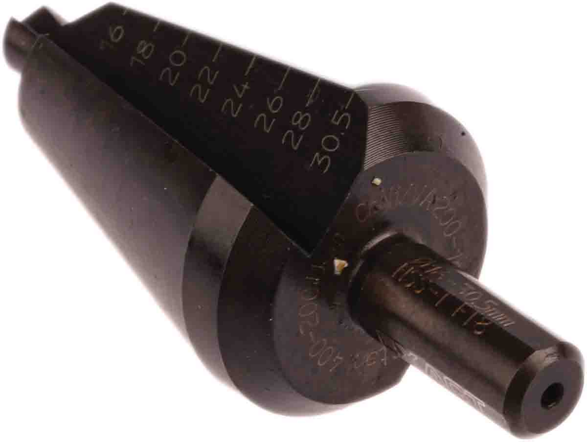 This is HSS 16 → 30.5mm Cone Cutter manufactured by EXACT. The manufacturer part number is 05203. It has a/an cone cutter type drill bit . It has a minimum 16mm size head . The product is made from highly stable and reliable hss. It has a maximum 30.5mm size head .
