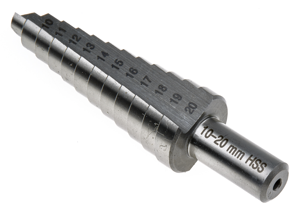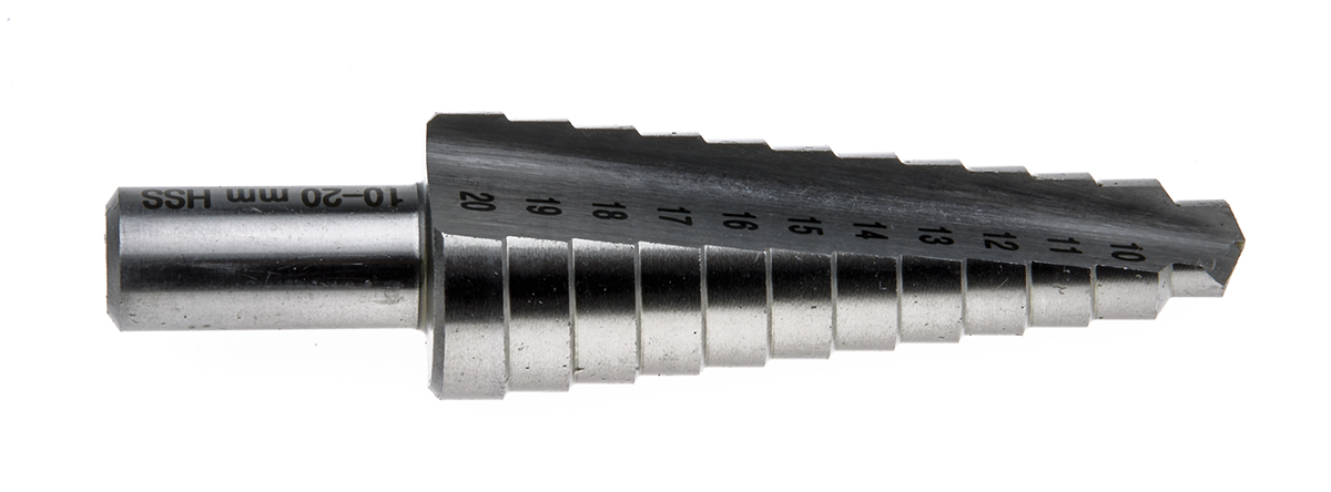 This is HSS 10 → 20mm Step Drill Bit 11 Steps manufactured by RS Pro. The manufacturer part number is 232-579. It has a/an step drill bit type drill bit . It has a minimum 10mm size head . The product is made from highly stable and reliable hss. In addition, the number of steps are 11 . It has a maximum 20mm size head .