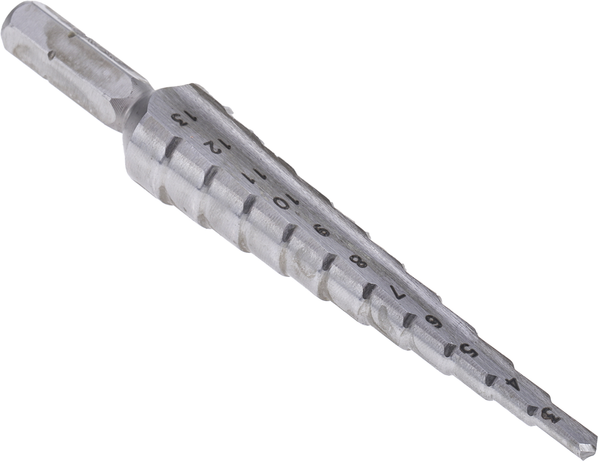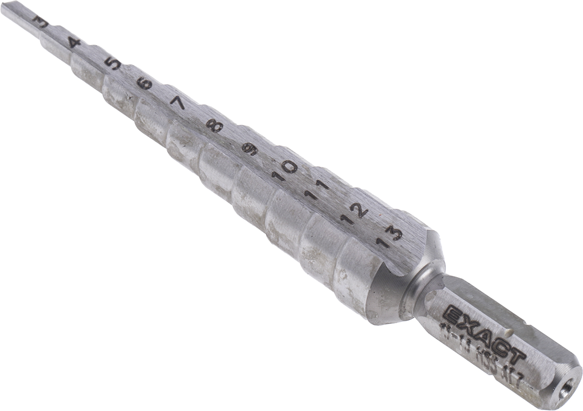 This is HSS 3 → 13mm Step Drill Bit 11 Steps manufactured by EXACT. The manufacturer part number is 05361. It has a/an step drill bit type drill bit . It has a minimum 3mm size head . The product is made from highly stable and reliable hss. In addition, the number of steps are 11 . It has a maximum 13mm size head .