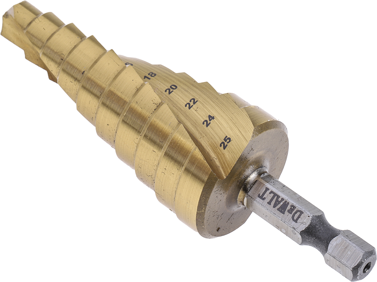 This is Dewalt HSS 14 → 25mm Step Drill Bit 9 Steps 25mm Max Drilling Thickness manufactured by DeWALT. The manufacturer part number is DT5030-QZ. It has a maximum 25mm size head . It has a minimum 14mm size head . The product is made from highly stable and reliable hss. In addition, the number of steps are 9 . It has a/an step drill bit type drill bit .
