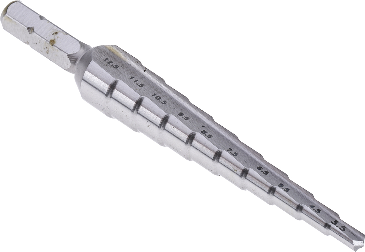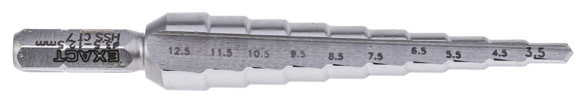 This is HSS 3.5 → 12.5mm Step Drill Bit 10 Steps manufactured by EXACT. The manufacturer part number is 05362. It has a/an step drill bit type drill bit . It has a minimum 3.5mm size head . The product is made from highly stable and reliable hss. In addition, the number of steps are 10 . It has a maximum 12.5mm size head .