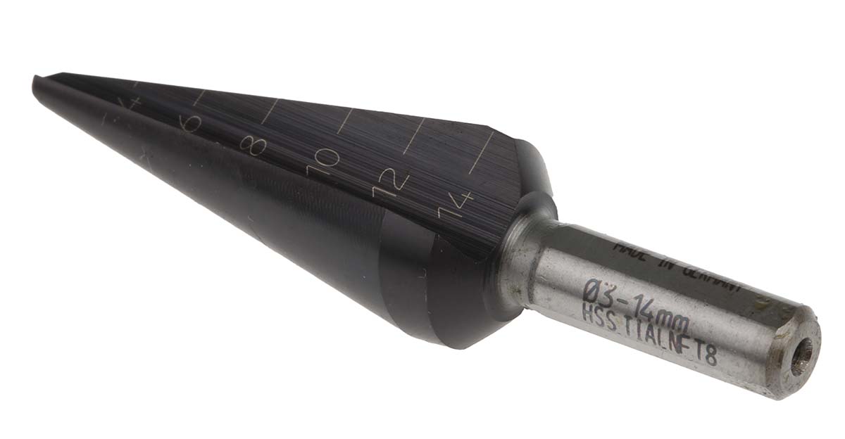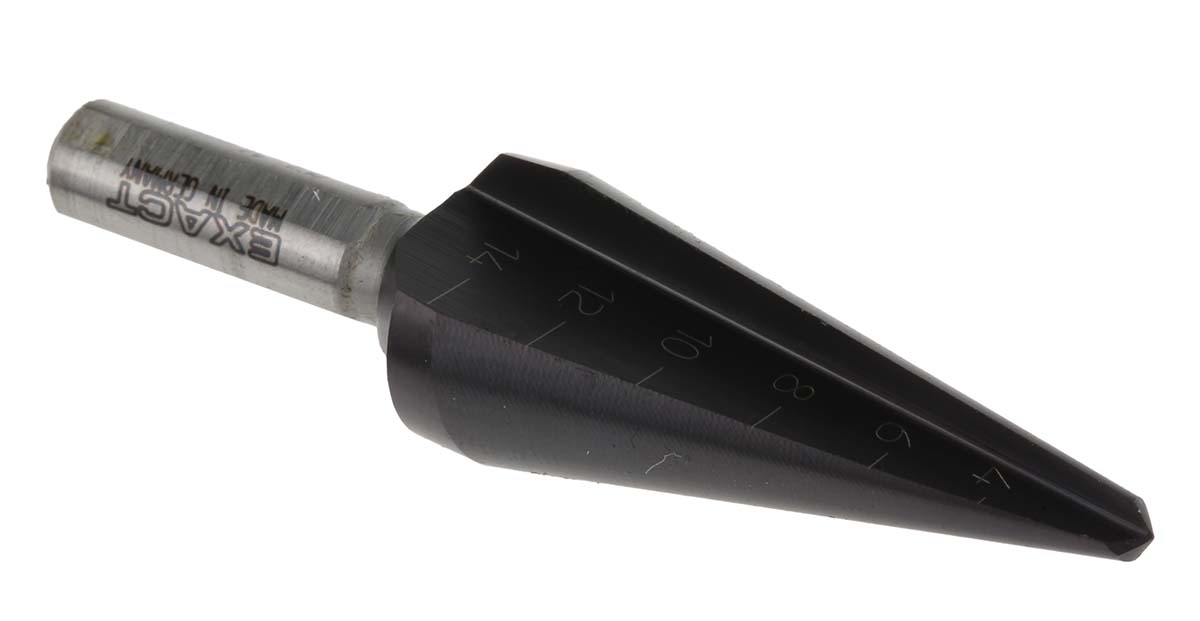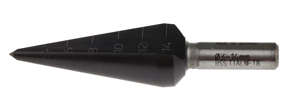 This is HSS 3 → 14mm Cone Cutter 14mm Max Drilling Thickness manufactured by EXACT. The manufacturer part number is 4450111. It has a/an cone cutter type drill bit . It has a minimum 3mm size head . The product is made from highly stable and reliable hss. It has a maximum 14mm size head .