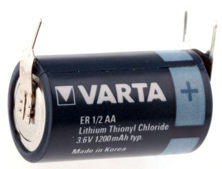 This is 3.6V Lithium Thionyl Chloride 1/2 AA Battery 1.2Ah manufactured by Varta. The manufacturer part number is 7126201302. The module has the capacity of 1.2ah. The given dimensions of the product include 14.6 x 25.1mm. The terminal is a pcb pin type. The nominal voltage of the product is 3.6v. It has a/an lithium thionyl chloride chemistry . The product is available in 1/2 aa size.