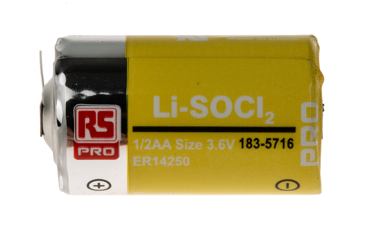 This is ER 14250 1/2AA Tag manufactured by RS PRO. The manufacturer part number is 183-5716. The module has the capacity of 1.2ah. The given dimensions of the product include 14.5 dia. x 25.5mm. Its brand range is rs pro . The number of supplied batteries is/are 1 . It comes with a/an er14252 IEC name . The nominal voltage of the product is 3.6v. It has a/an lithium thionyl chloride chemistry . The terminal is a tags type. The product is available in 1/2 aa size.