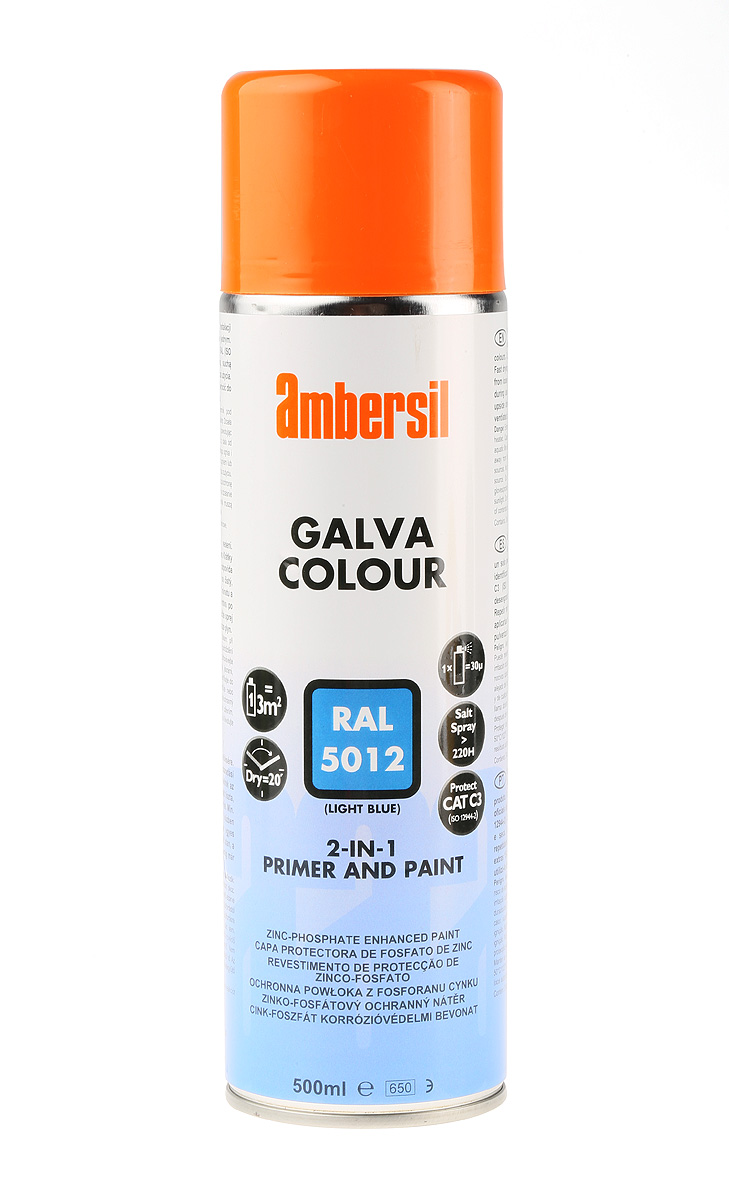 This is Blue 500mL Satin Finish Galvanised Paint for use with Anti-Corrosion Primer manufactured by Ambersil. The manufacturer part number is 6190011533. Its RAL code is ral 5012 . It is assigned with a trade name of galva colour. It has a decent blue colour. A quality product with a nice satin finish. It has approximately 500ml size can .