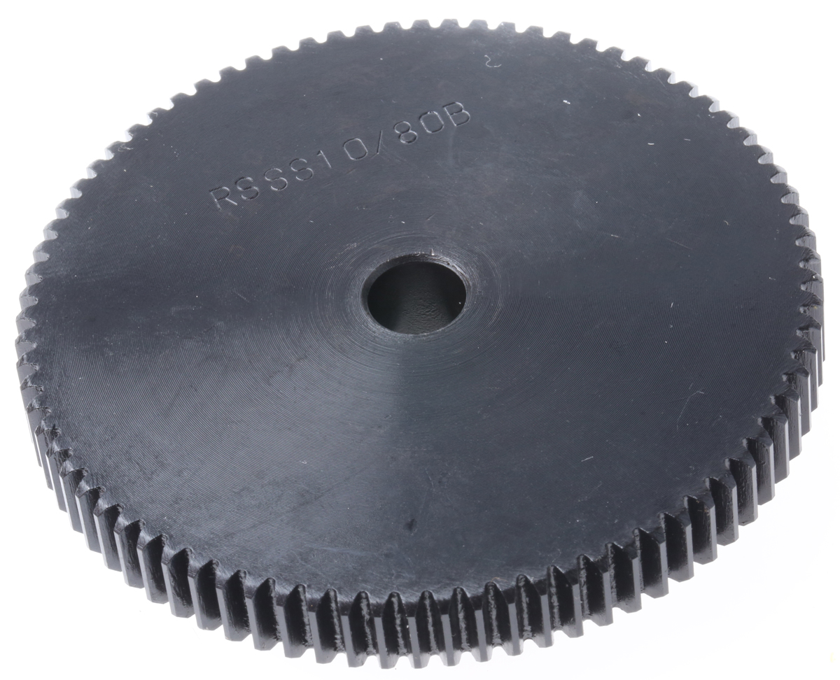 This is Steel 80 Teeth Spur Gear 80mm Pitch Diam. 40mm Hub Diam. 10mm Bore Diam. manufactured by RS Pro. The manufacturer part number is 521-6389. The product is made from highly stable and reliable steel. Its face is 10mm in width . It includes 1 module . It has about 80mm pitch diameter . It contains a standard 10mm bore diameter . It contains 80 teeth. Its hub diameter is 40mm .