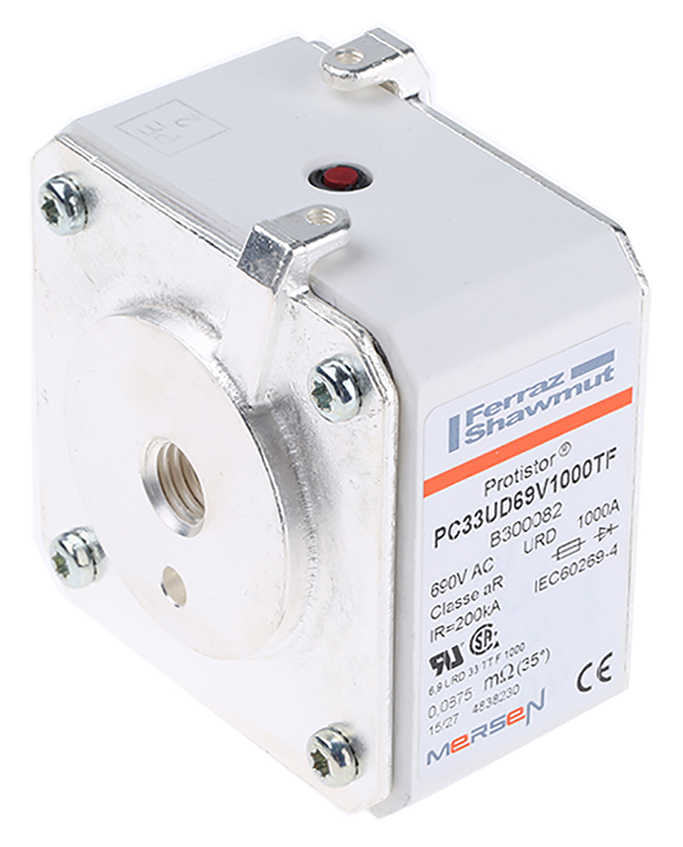 This is 1kA size 33 FF Square Body Flush End Contacts Fuse aR 700V manufactured by Mersen. The manufacturer part number is B300082. The product has a ar application category. The product has a current rating of 1ka. Moreover, the product has a nominal 700v voltage rating. A fuse with a 33 size. Its body length is 74.5mm. The fuse has a robust ff speed. Its body height is 79.5mm. The fuse complies with din 43653, nf en 60269-1, nf en 60269-4 standards. Moreover, it has a high rupture capacity yes . Its overall body width is 50.6mm .