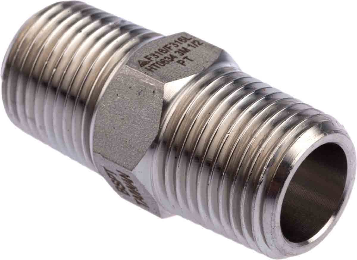 This is Stainless Steel Hexagon Straight Nipple Joint 1/2in R(T) Male x 1/2in R(T) Male 1.89in manufactured by RS Pro. The manufacturer part number is 826-7052. The fitting direction is straight . This nipple tool is easy to use with versatile applications in various settings. It has a standard 1/2in thread size 2 . Its accurate length is 48.006mm. It has a standard 1/2in thread size 1 . Additionally, its pipe fitting connection is of threaded type . It is a hexagon product with unique specifications. Moreover, its thread is of r (taper) standard 2 . Its connection 1 is of male gender . In addition, its connection is of male gender 2 . In addition, it has a thread of r (taper) standard 1 .
