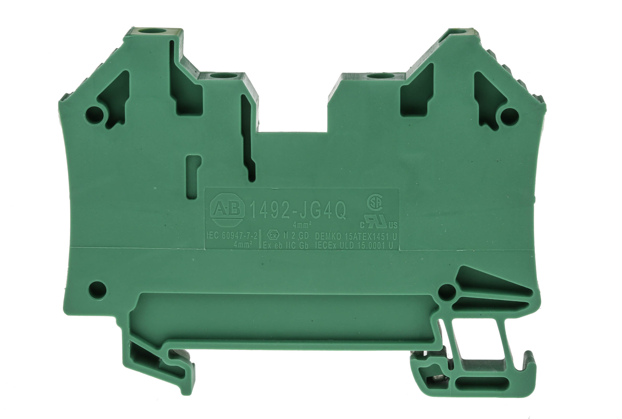 This is 1492 Series Screw Terminal 3-Way 10A 22 → 12 Wire Screw Cage Termination manufactured by Allen Bradley. The manufacturer part number is 1492-JG4Q. It is fused no . The product is available in din rail configuration. Moreover, the product has a nominal 300 v voltage rating. In addition, female is the available "Gender" of the product. It has a decent green/yellow colour. The product is made from highly stable and reliable plastic. It allows screw cage termination method. It comprises 3 ways. The product 1492, is a highly preferred choice for users. The product has a current rating of 10a. Concerning wire's size, it is 22 → 12.