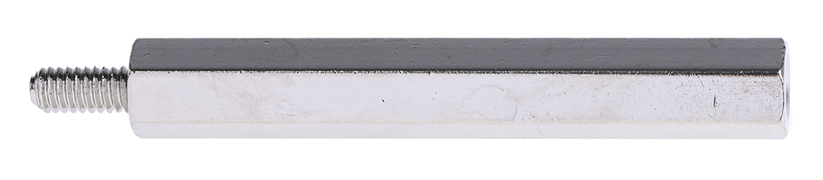 This is Brass Hex Standoff Male/Female 50mm M4 x M4 manufactured by RS Pro. The manufacturer part number is 806-6742. A quality product with a nice nickel plated finish. Its hole depth is 15mm . It has a hex shape body . It has a standard 7mm hex size across flat . The product is made from highly stable and reliable brass. It has a typical thread size of m4 x m4. Its body length is 50mm. It has a male/female type gender . Its stud is 8mm in length . The product has a premium-quality m4 thread size B . It has a standard m4 thread size A .