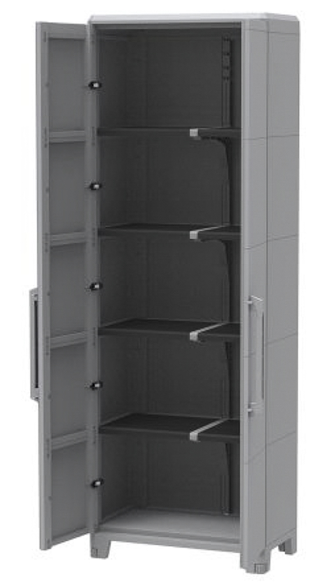 This is 2 Doors Plastic Lockable Floor Standing Tool Cabinet 780 x 430 x 2250mm manufactured by RS Pro. The manufacturer part number is 136-8876. It has a floor standing trait yes . It contains 2 dedicated doors . The given dimensions of the product include 780 x 430 x 2250mm. It has a decent grey colour. The product is made from highly stable and reliable plastic. In addition, the height is 2250mm. Furthermore, the product is 780mm wide. The product comes in 430mm depth. It contains 4 high quality shelves . It has a lockable nature yes . It comes in transforming modular configuration.