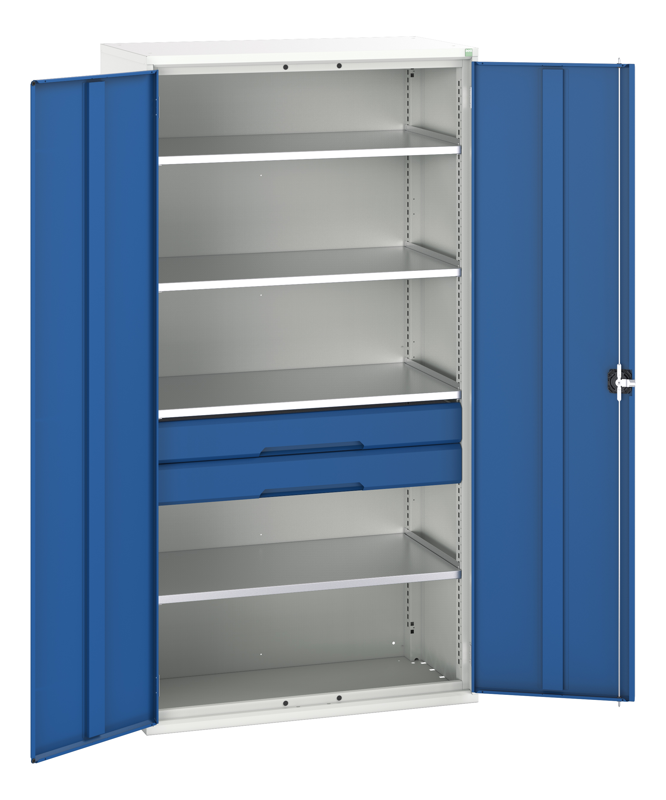 This is Floor Standing Tool Cabinet manufactured by Bott. The manufacturer part number is 16926574.11. It has a floor standing trait yes . It contains 4 high quality shelves . The given dimensions of the product include 1050 x 550 x 2000mm. It has a decent blue, grey colour. The product is made from highly stable and reliable steel. In addition, the height is 2000mm. Furthermore, the product is 1.05m wide. The product comes in 550mm depth. It includes 2 high-quality drawers . It has a lockable nature yes . It comes in cupboard with shelf configuration.