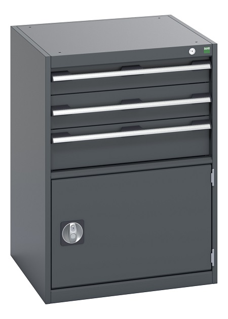 This is 1 Door Steel Lockable Floor Standing Cabinet 650 x 650 x 900mm manufactured by Bott. The manufacturer part number is 40019043.77V. It has a floor standing trait yes . It contains 1 dedicated doors . It contains 1 high quality shelves . The given dimensions of the product include 650 x 650 x 900mm. It has a decent dark grey colour. The product is made from highly stable and reliable steel. It includes 3 high-quality drawers . It has a lockable nature yes . It comes in cabinet configuration.