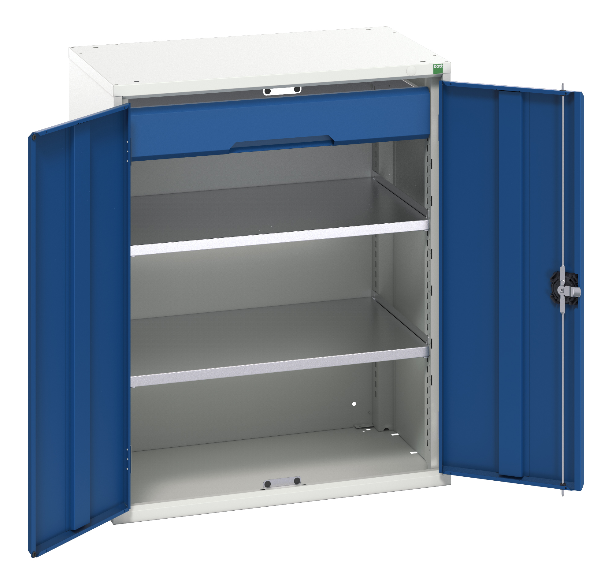 This is 2 Door Sheet Steel Lockable Floor Standing Cupboard 800 x 550 x 1000mm manufactured by Bott. The manufacturer part number is 16926452.11. It has a floor standing trait yes . It contains 2 dedicated doors . It contains 2 high quality shelves . The given dimensions of the product include 800 x 550 x 1000mm. The product is made from highly stable and reliable sheet steel. It includes 1 high-quality drawers . It has a lockable nature yes . It comes in kitted cupboard configuration.