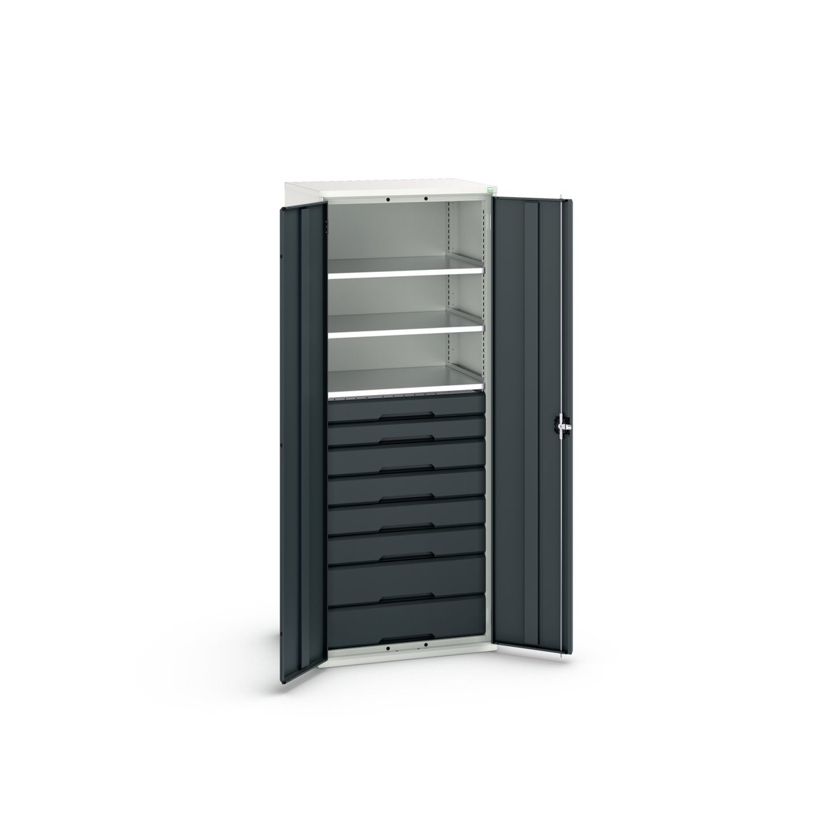 This is 2 Door Sheet Steel Lockable Floor Standing Cupboard 800 x 550 x 2000mm manufactured by Bott. The manufacturer part number is 16926458.19. It has a floor standing trait yes . It contains 2 dedicated doors . It contains 3 high quality shelves . The given dimensions of the product include 800 x 550 x 2000mm. The product is made from highly stable and reliable sheet steel. It includes 8 high-quality drawers . It has a lockable nature yes . It comes in kitted cupboard configuration.