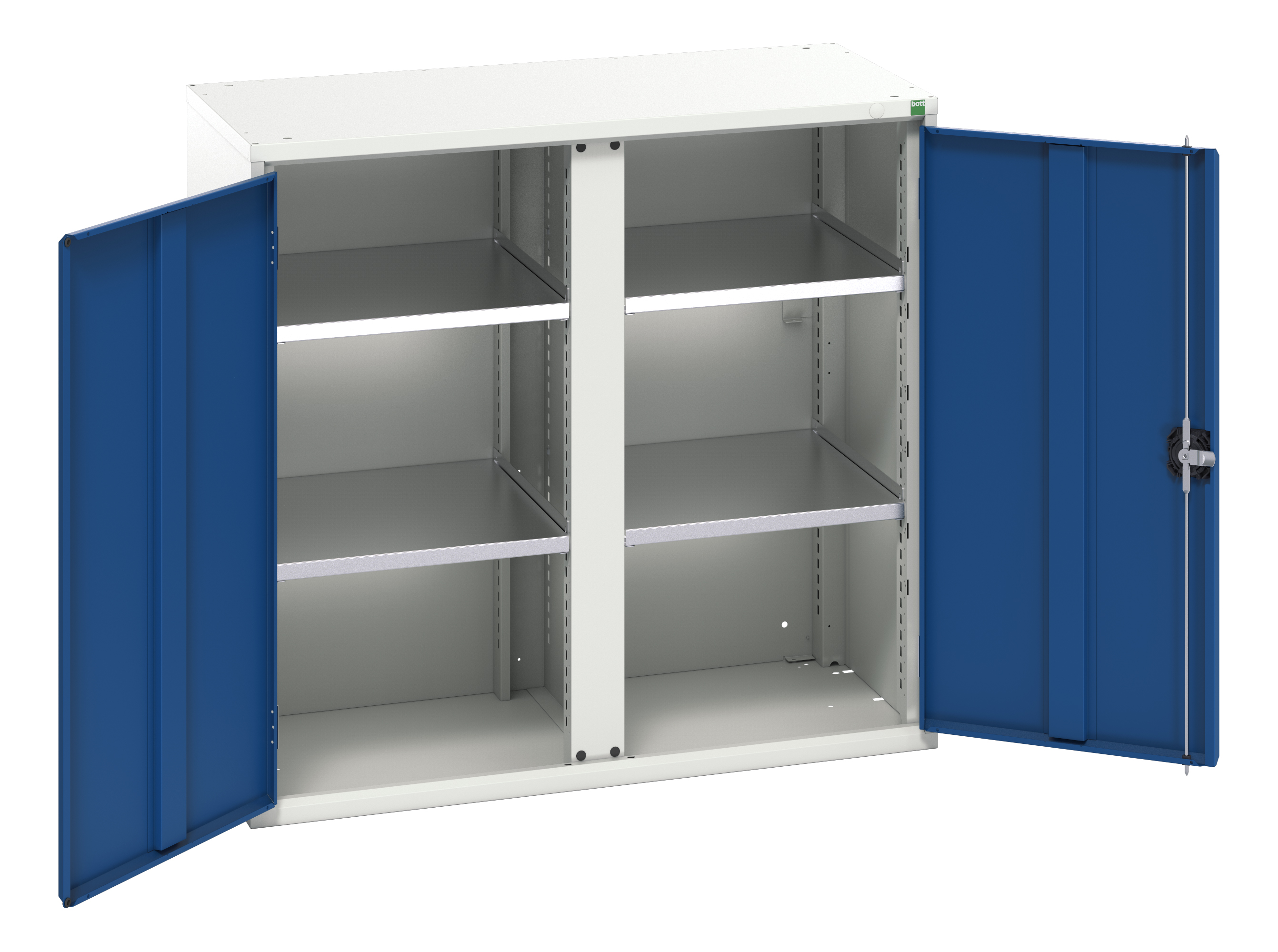 This is 2 Door Sheet Steel Lockable Floor Standing Cupboard 1050 x 550 x 1000mm manufactured by Bott. The manufacturer part number is 16926555.11. It has a floor standing trait yes . It contains 2 dedicated doors . It contains 4 high quality shelves . The given dimensions of the product include 1050 x 550 x 1000mm. The product is made from highly stable and reliable sheet steel. It includes 0 high-quality drawers . It has a lockable nature yes . It comes in kitted cupboard configuration.