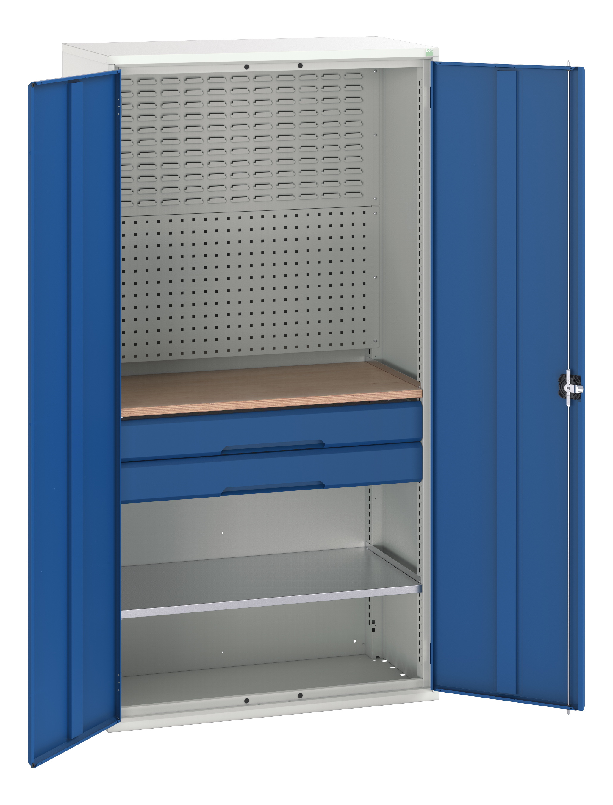 This is 2 Door Sheet Steel Lockable Floor Standing Cupboard 1050 x 550 x 2000mm manufactured by Bott. The manufacturer part number is 16926571.11. It has a floor standing trait yes . It contains 2 dedicated doors . It contains 1 high quality shelves . The given dimensions of the product include 1050 x 550 x 2000mm. The product is made from highly stable and reliable sheet steel. It includes 2 high-quality drawers . It has a lockable nature yes . It comes in kitted cupboard configuration.