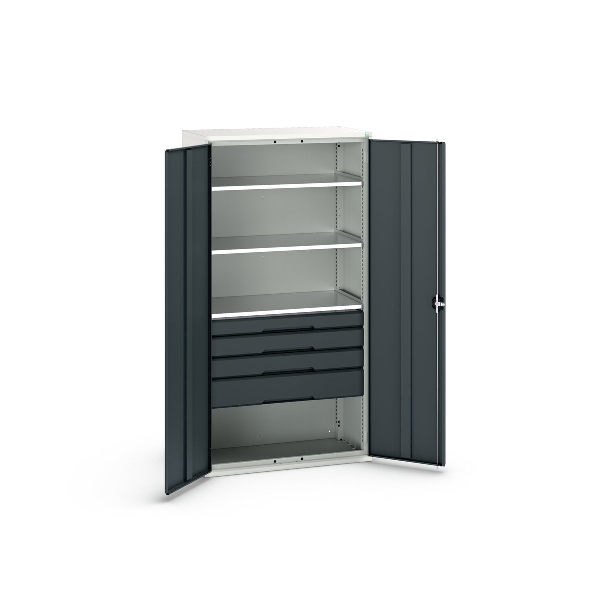 This is 2 Door Sheet Steel Lockable Floor Standing Cupboard 1050 x 550 x 2000mm manufactured by Bott. The manufacturer part number is 16926576.19. It has a floor standing trait yes . It contains 2 dedicated doors . It contains 3 high quality shelves . The given dimensions of the product include 1050 x 550 x 2000mm. The product is made from highly stable and reliable sheet steel. It includes 4 high-quality drawers . It has a lockable nature yes . It comes in kitted cupboard configuration.