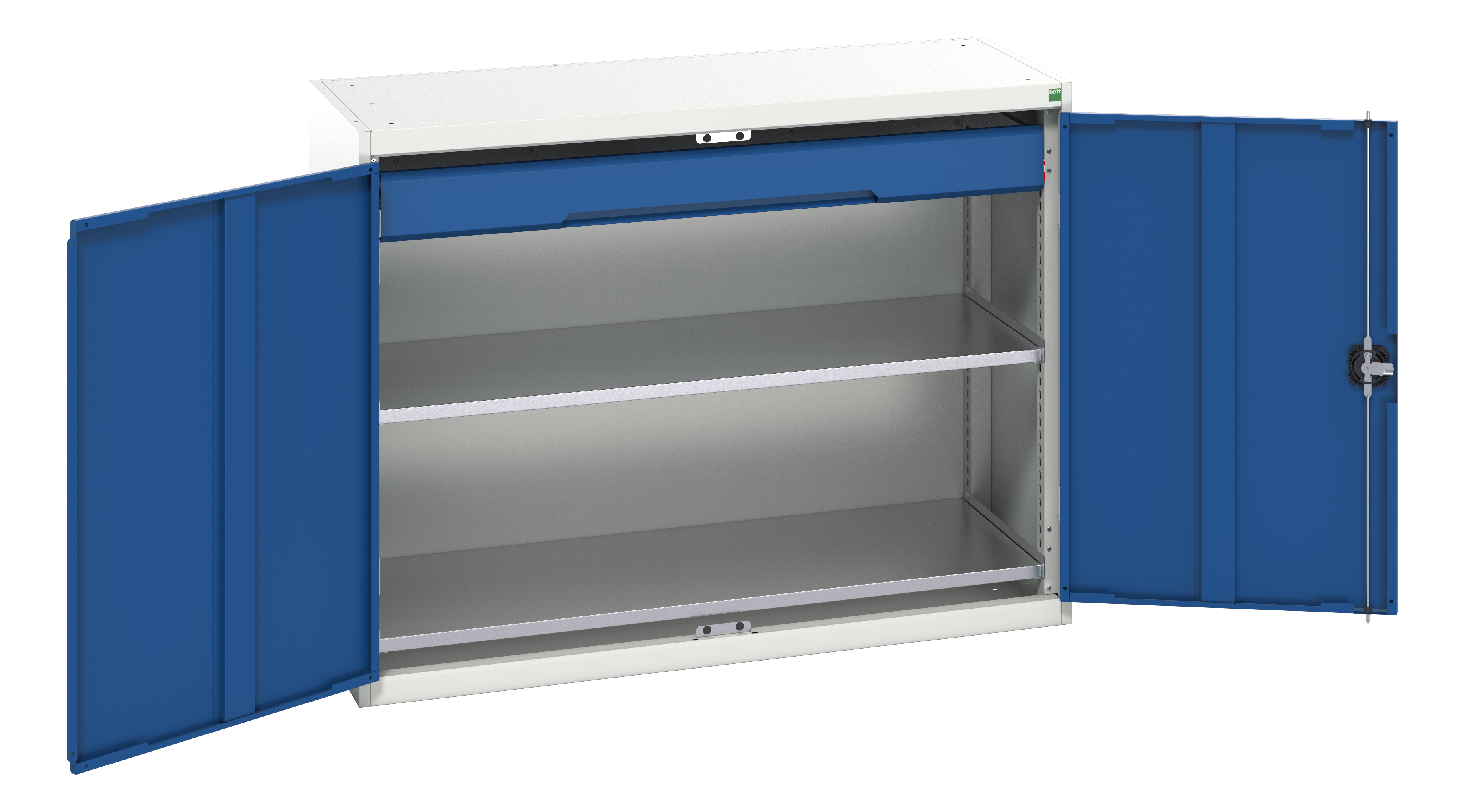 This is 2 Door Sheet Steel Lockable Floor Standing Cupboard 1300 x 550 x 1000mm manufactured by Bott. The manufacturer part number is 16926604.11. It has a floor standing trait yes . It contains 2 dedicated doors . It contains 2 high quality shelves . The given dimensions of the product include 1300 x 550 x 1000mm. The product is made from highly stable and reliable sheet steel. It includes 1 high-quality drawers . It has a lockable nature yes . It comes in kitted cupboard configuration.