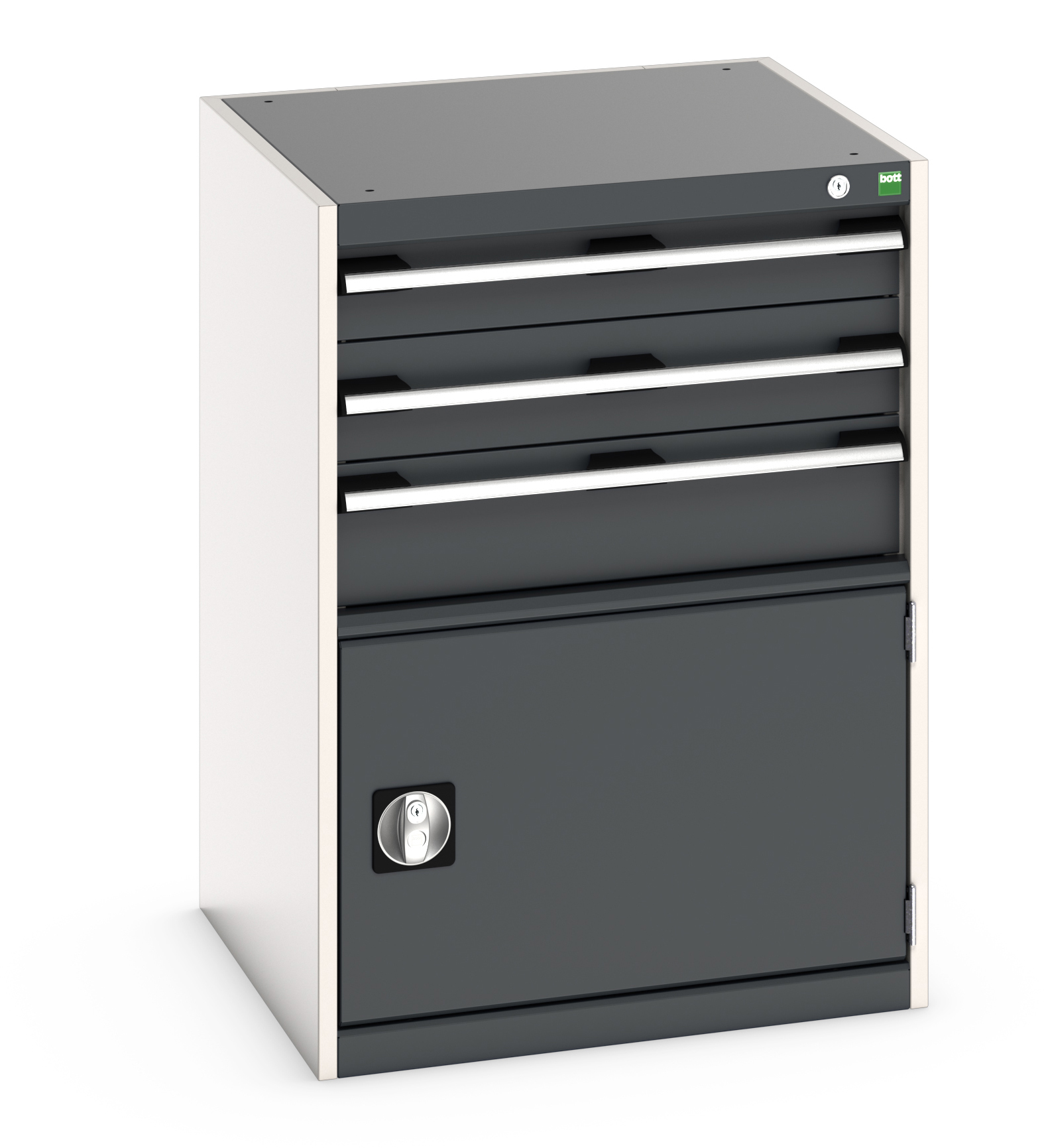 This is 1 Door 3 Drawer Sheet Steel Floor Standing Cabinet 650 x 650 x 900mm manufactured by Bott. The manufacturer part number is 40019043.19V. It has a floor standing trait yes . It contains 1 dedicated doors . The given dimensions of the product include 650 x 650 x 900mm. The product is made from highly stable and reliable sheet steel. It includes 3 high-quality drawers . It comes in cabinet configuration.