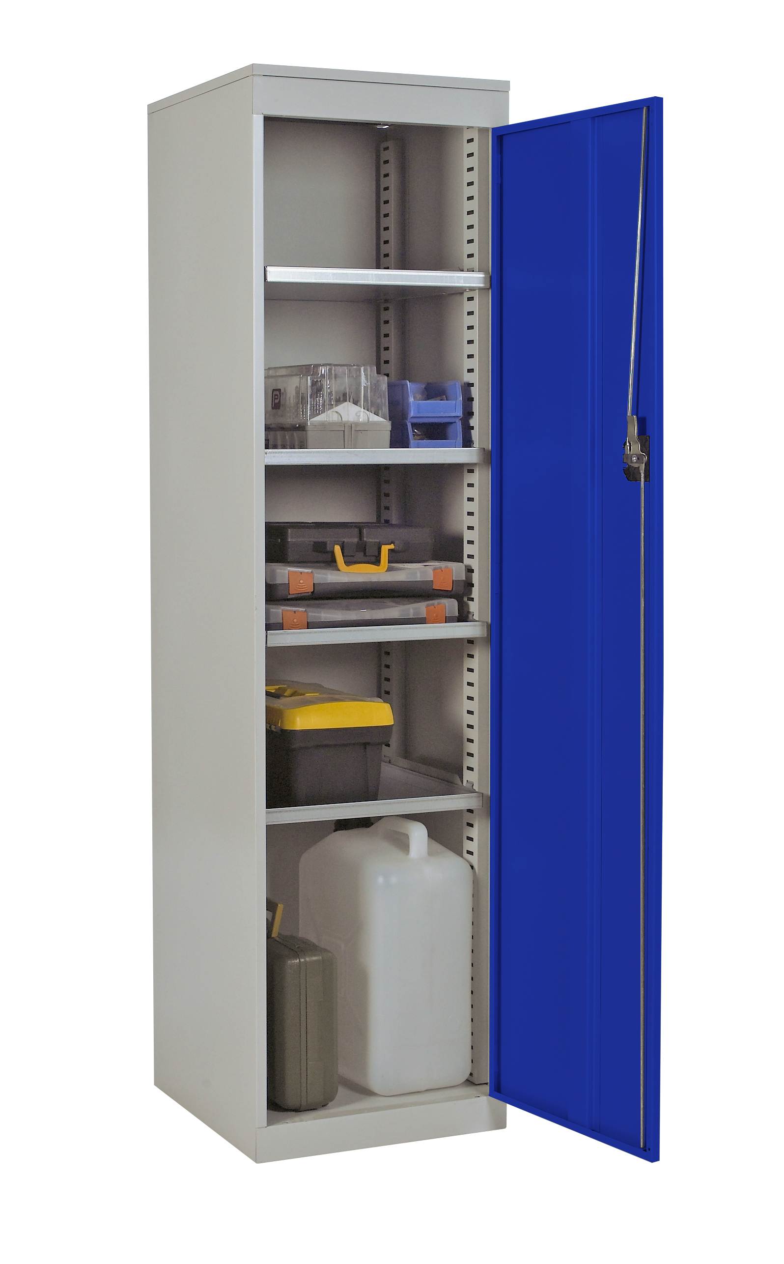 This is 1 Door Steel Floor Standing Tool Cabinet 1820 x 477 x 505mm manufactured by RS PRO. The manufacturer part number is 213-844. It has a floor standing trait yes . It contains 1 dedicated doors . The given dimensions of the product include 1820 x 477 x 505mm. The product is made from highly stable and reliable steel. It contains 4 high quality shelves . It comes in cabinet configuration.
