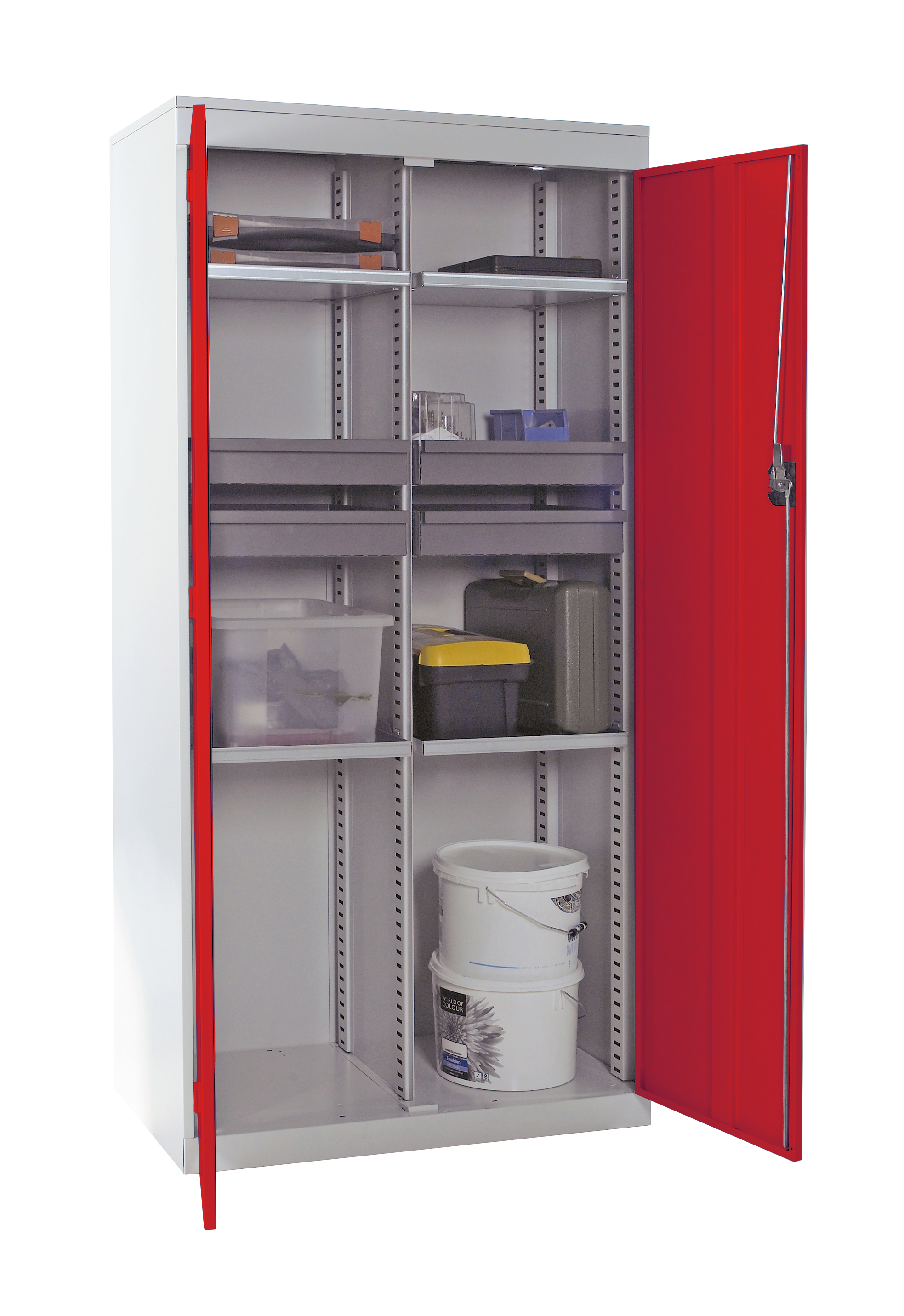 This is 2 Door 4 Drawer Steel Floor Standing Tool Cabinet 1820 x 915 x 505mm manufactured by RS PRO. The manufacturer part number is 214-046. It has a floor standing trait yes . It contains 2 dedicated doors . The given dimensions of the product include 1820 x 915 x 505mm. The product is made from highly stable and reliable steel. It contains 4 high quality shelves . It includes 4 high-quality drawers . It comes in cabinet configuration.