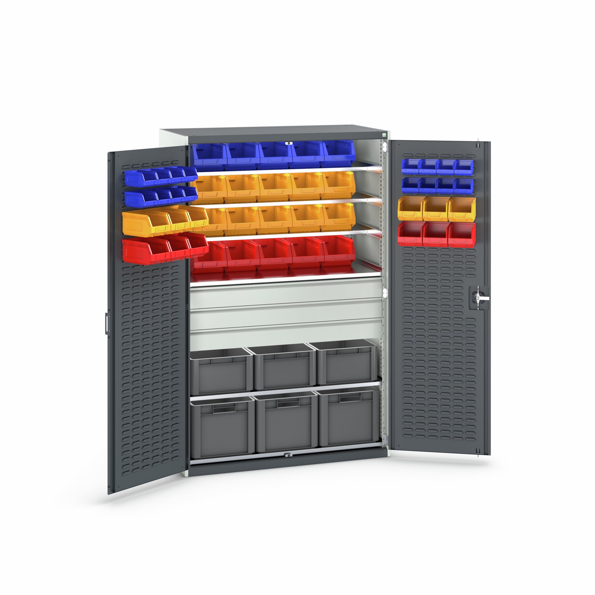 This is 2 Door 3 Drawer Sheet Steel Floor Standing Cupboard 1300 X 650 X 2000mm manufactured by Bott. The manufacturer part number is 40022096.19V. It has a floor standing trait yes . It contains 2 dedicated doors . The given dimensions of the product include 1300 x 650 x 2000mm. The product is made from highly stable and reliable sheet steel. It contains 6 high quality shelves . It includes 3 high-quality drawers .