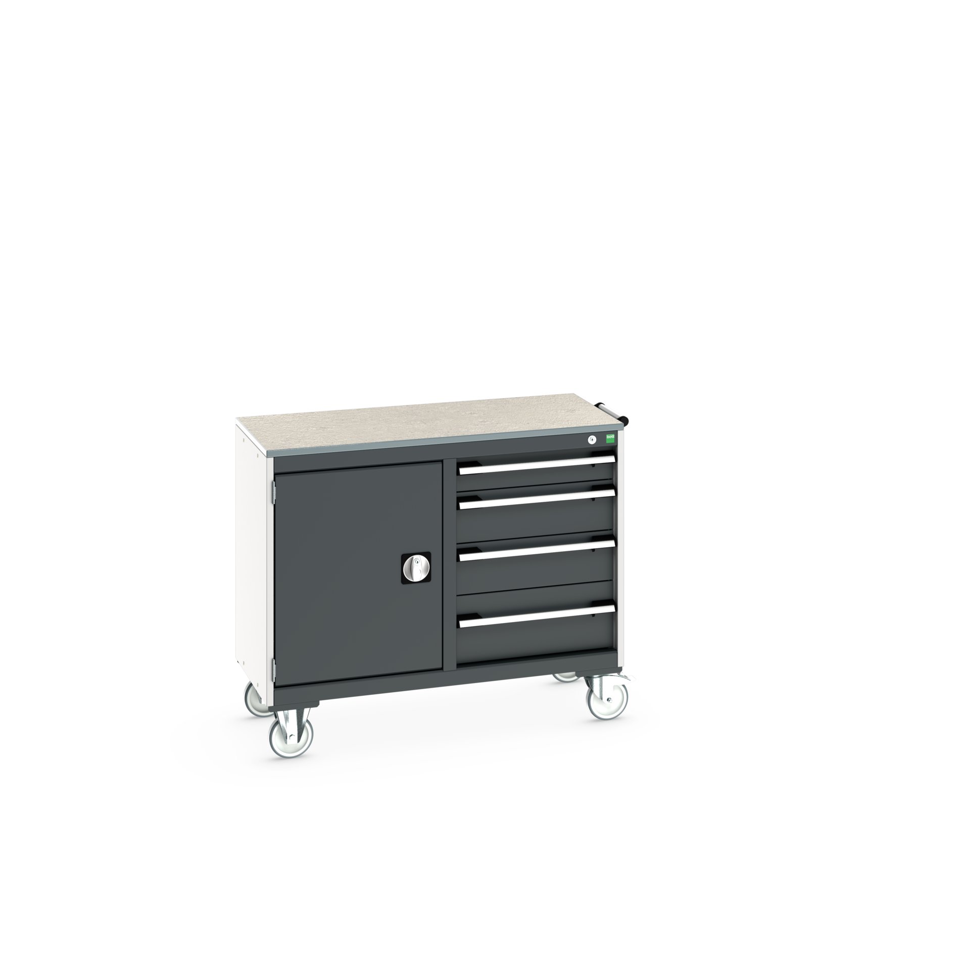 This is 1 Door 4 Drawer Sheet Steel Floor Standing Storage Cabinet 1050 X 525 X 890mm manufactured by Bott. The manufacturer part number is 41006005.19V. It has a floor standing trait yes . It contains 1 dedicated doors . The given dimensions of the product include 1050 x 525 x 890mm. The product is made from highly stable and reliable sheet steel. It contains 1 high quality shelves . It includes 4 high-quality drawers . It comes in mobile cabinet configuration.