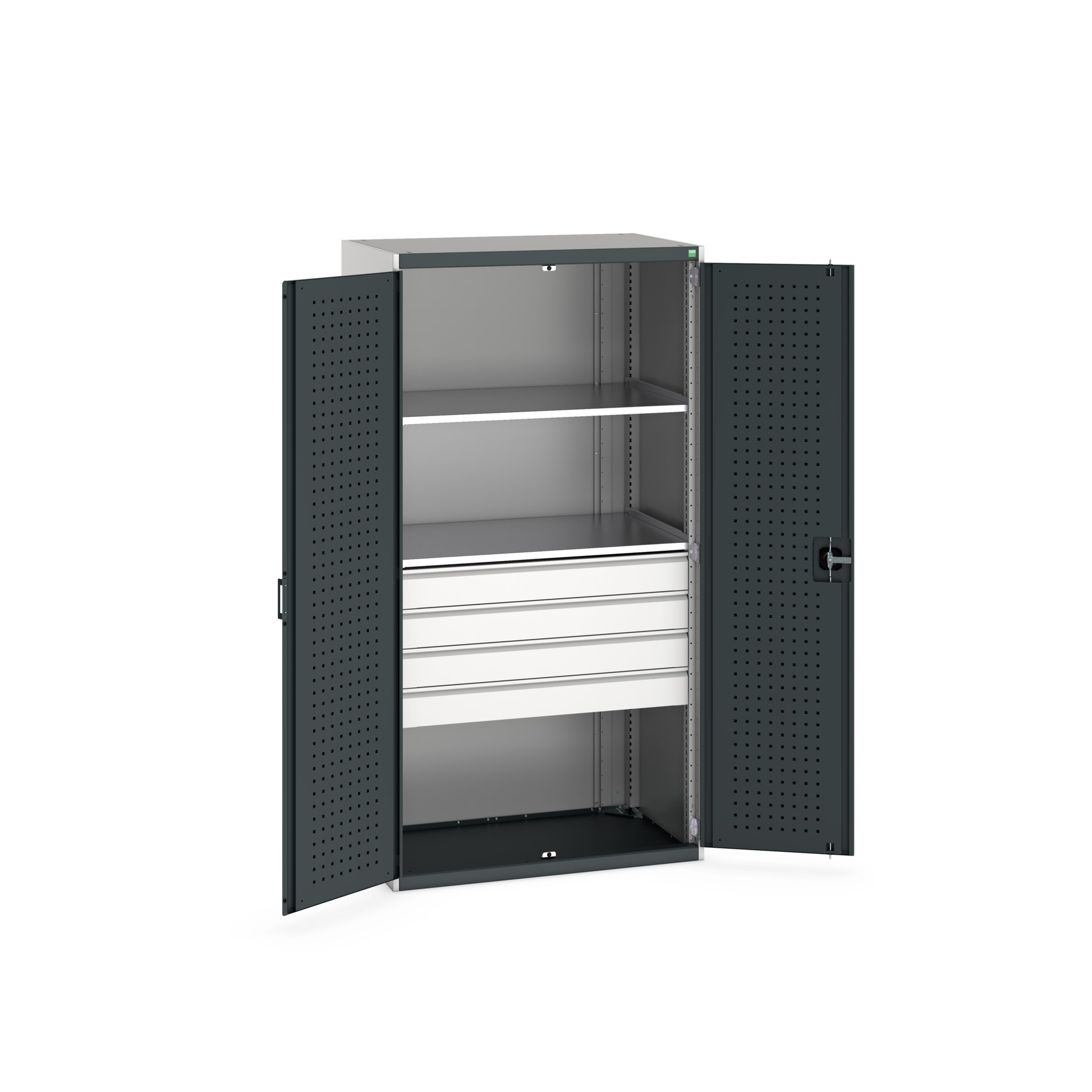 This is 2 Door 4 Drawer Sheet Steel Floor Standing Cupboard 1050 X 650 X 2000mm manufactured by Bott. The manufacturer part number is 40021108.19V. It has a floor standing trait yes . It contains 2 dedicated doors . The given dimensions of the product include 1050 x 650 x 2000mm. The product is made from highly stable and reliable sheet steel. It contains 2 high quality shelves . It includes 4 high-quality drawers . It comes in kitted cupboard configuration.