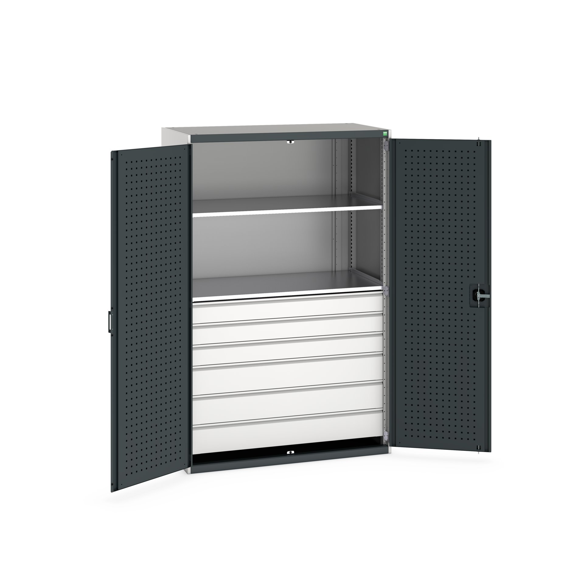 This is 2 Door 6 Drawer Sheet Steel Floor Standing Cupboard 1300 X 650 X 2000mm manufactured by Bott. The manufacturer part number is 40022141.19V. It has a floor standing trait yes . It contains 2 dedicated doors . The given dimensions of the product include 1300 x 650 x 2000mm. The product is made from highly stable and reliable sheet steel. It contains 2 high quality shelves . It includes 6 high-quality drawers . It comes in kitted cupboard configuration.