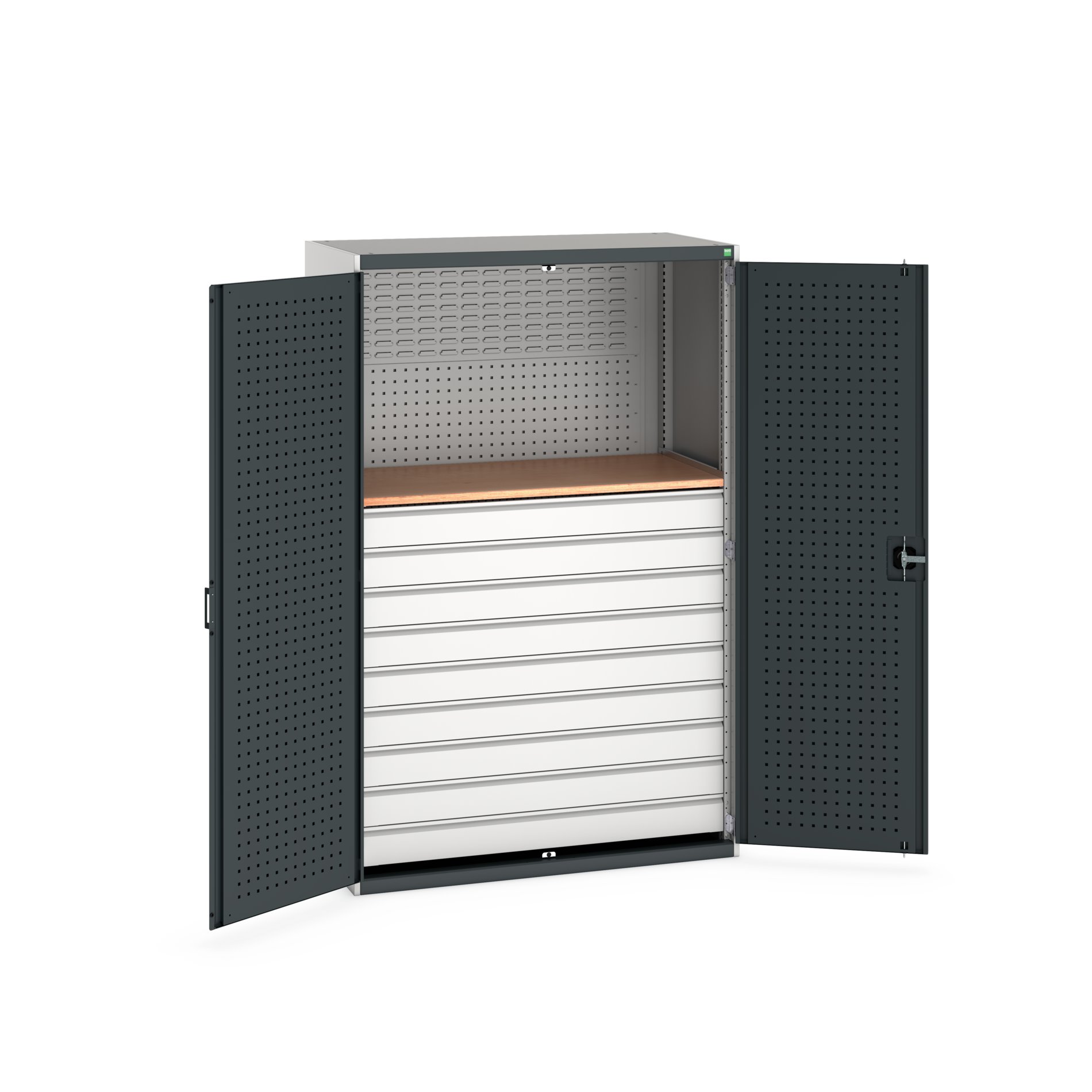 This is 2 Door 9 Drawer Sheet Steel Floor Standing Cupboard 1300 X 650 X 2000mm manufactured by Bott. The manufacturer part number is 40022093.19V. It has a floor standing trait yes . It contains 2 dedicated doors . The given dimensions of the product include 1300 x 650 x 2000mm. The product is made from highly stable and reliable sheet steel. It contains 1 high quality shelves . It includes 9 high-quality drawers . It comes in mini workshop cupboard configuration.