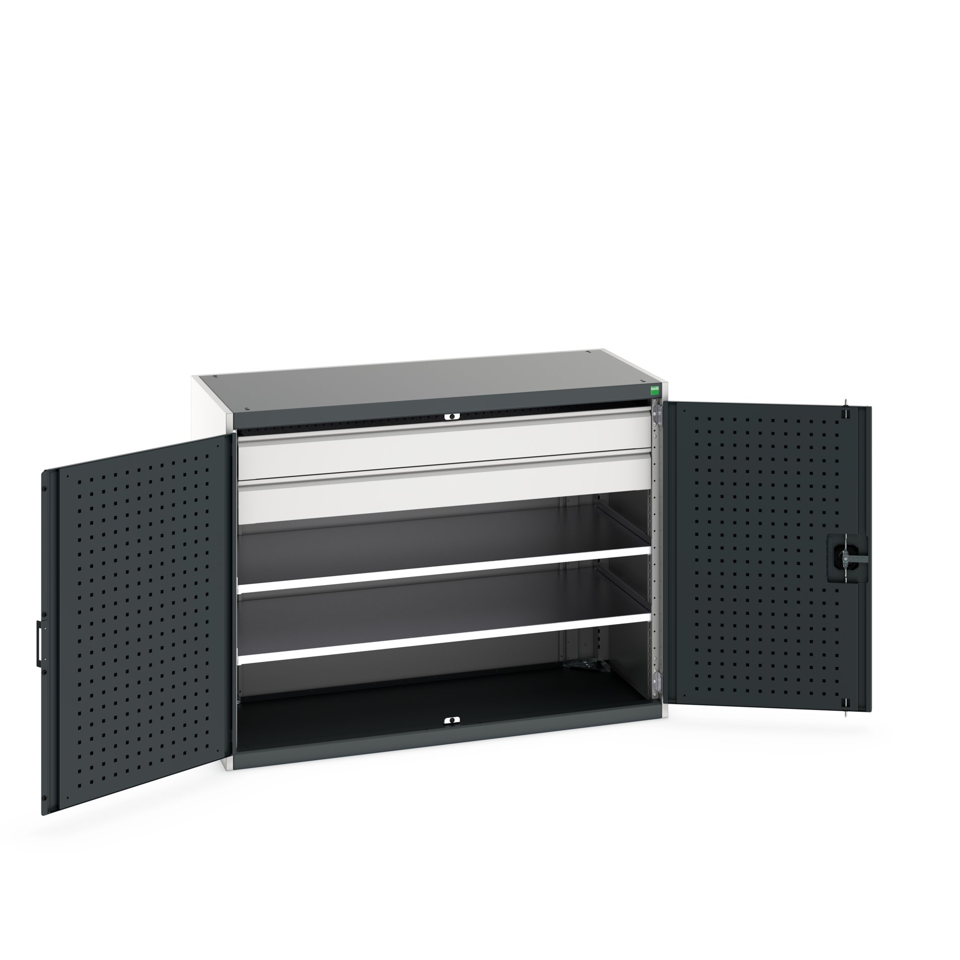 This is 2 Door 2 Drawer Sheet Steel Floor Standing Cupboard 1300 X 650 X 1000mm manufactured by Bott. The manufacturer part number is 40022084.19V. It has a floor standing trait yes . It contains 2 dedicated doors . The given dimensions of the product include 1300 x 650 x 1000mm. The product is made from highly stable and reliable sheet steel. It contains 2 high quality shelves . It includes 2 high-quality drawers . It comes in kitted cupboard configuration.