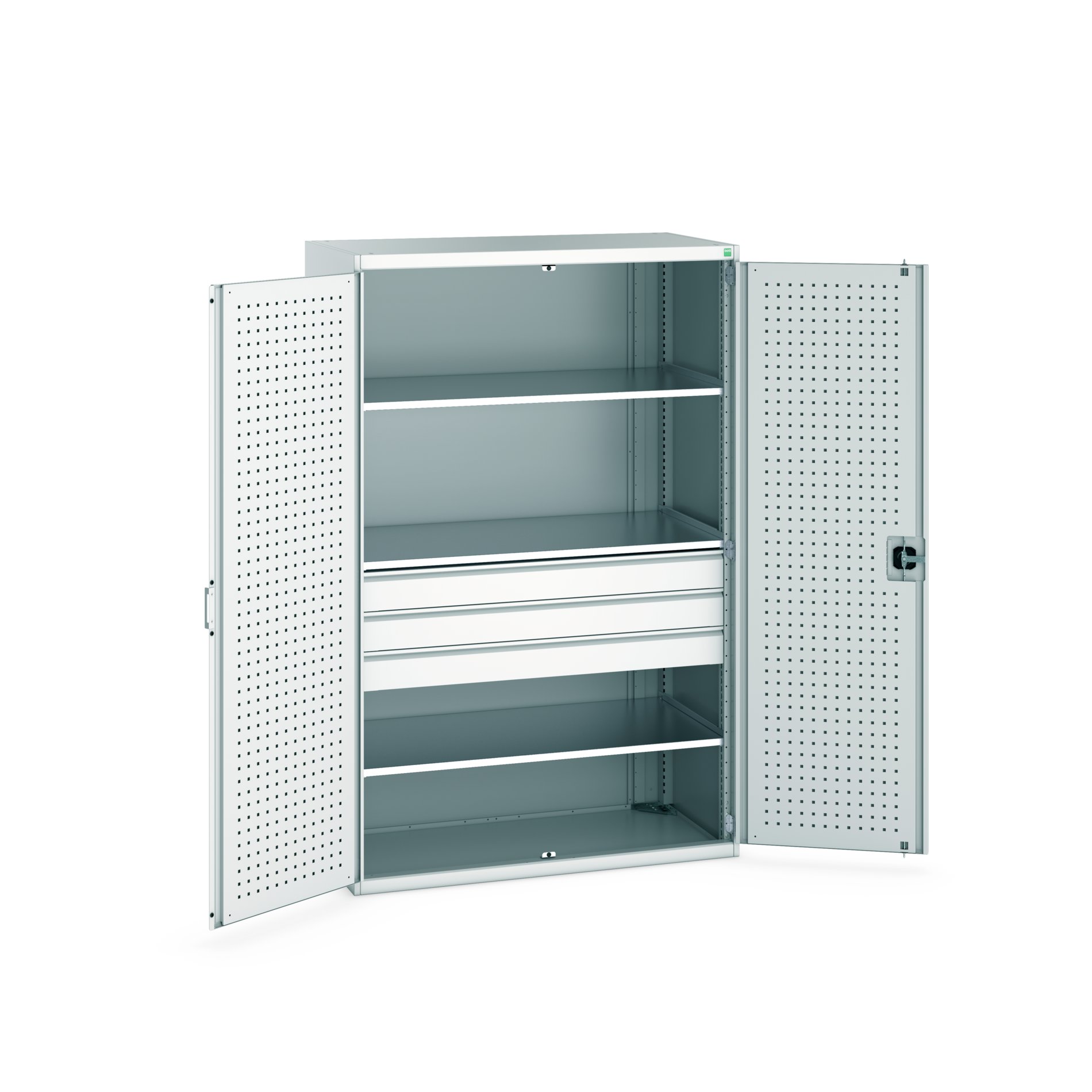This is 2 Door 3 Drawer Sheet Steel Floor Standing Cupboard 1300 X 650 X 2000mm manufactured by Bott. The manufacturer part number is 40022087.16V. It has a floor standing trait yes . It contains 2 dedicated doors . The given dimensions of the product include 1300 x 650 x 2000mm. The product is made from highly stable and reliable sheet steel. It contains 3 high quality shelves . It includes 3 high-quality drawers . It comes in kitted cupboard configuration.