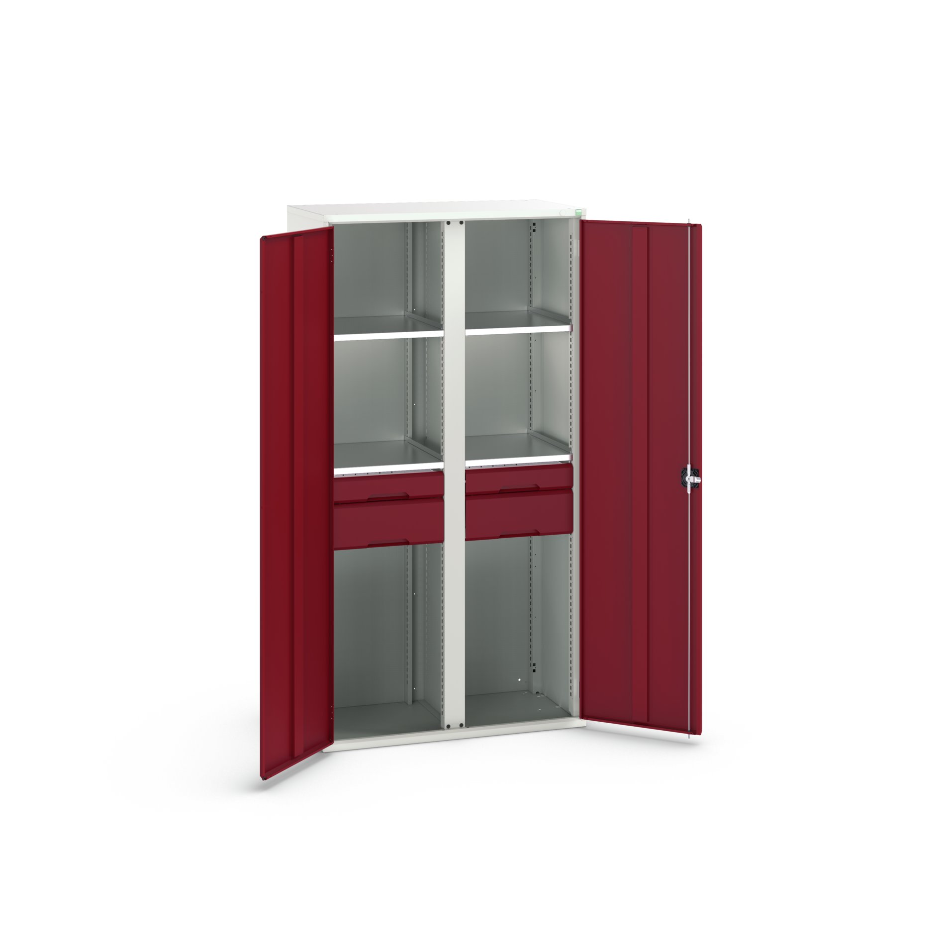 This is 2 Door 4 Drawer Sheet Steel Cupboard 1050 x 550 x 2000mm manufactured by Bott. The manufacturer part number is 16926582.24. It contains 2 dedicated doors . The given dimensions of the product include 1050 x 550 x 2000mm. The product is made from highly stable and reliable sheet steel. It contains 4 high quality shelves . It includes 4 high-quality drawers . It comes in kitted cupboard configuration.