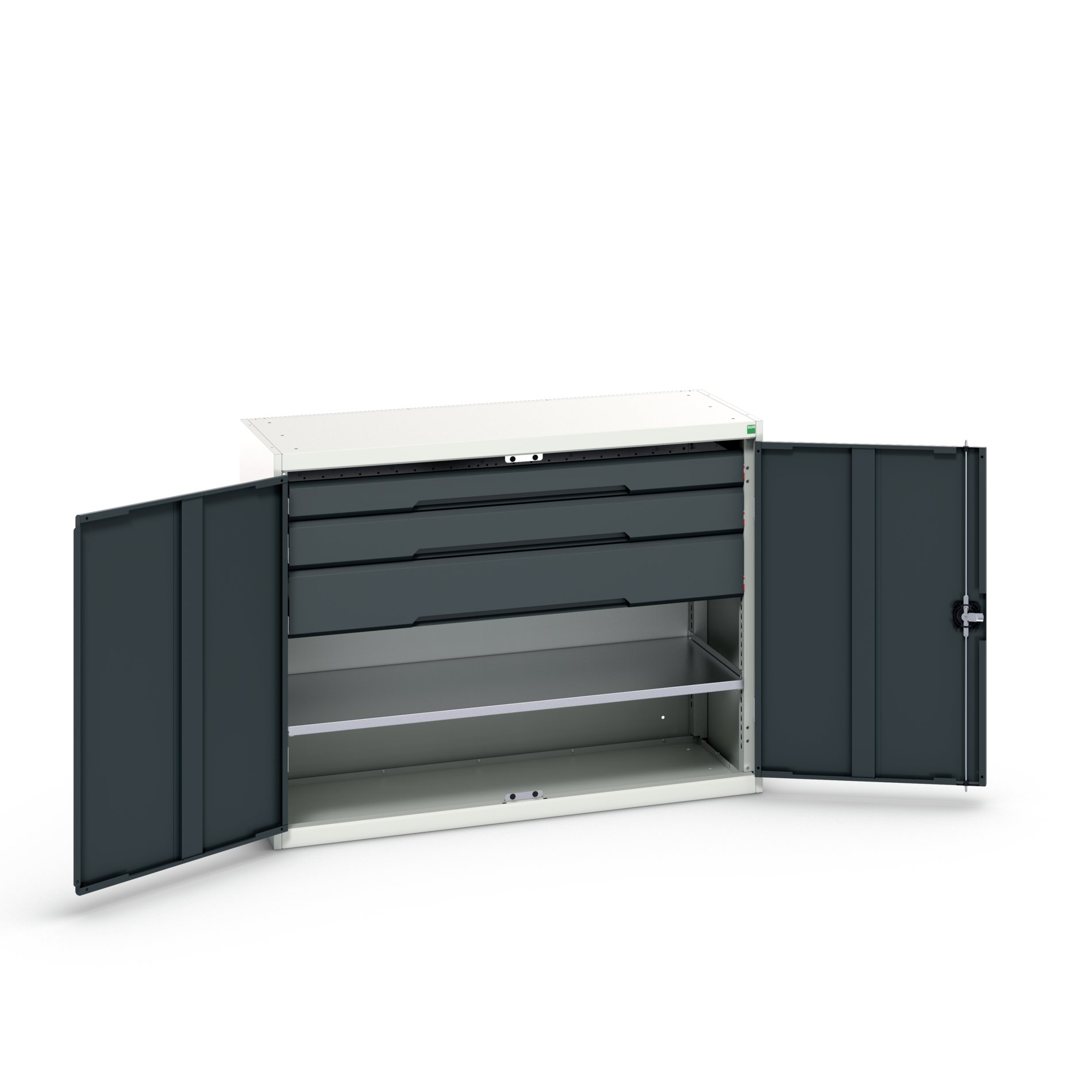 This is 2 Door 3 Drawer Sheet Steel Cupboard 1300 x 550 x 1000mm manufactured by Bott. The manufacturer part number is 16926607.19. It contains 2 dedicated doors . The given dimensions of the product include 1300 x 550 x 1000mm. The product is made from highly stable and reliable sheet steel. It contains 1 high quality shelves . It includes 3 high-quality drawers . It comes in kitted cupboard configuration.