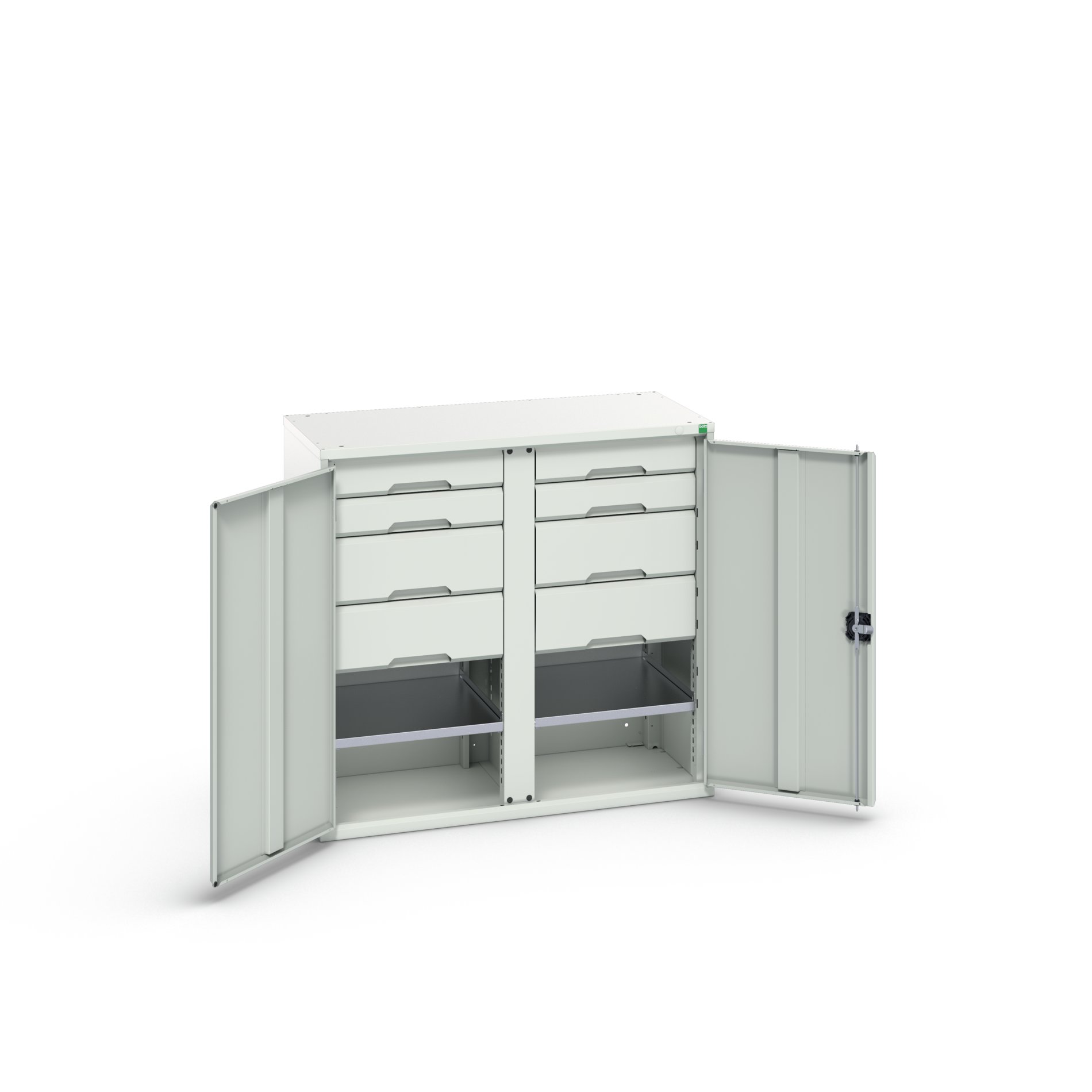 This is 2 Door 8 Drawer Sheet Steel Cupboard 1050 x 550 x 1000mm manufactured by Bott. The manufacturer part number is 16926557.16. It contains 2 dedicated doors . The given dimensions of the product include 1050 x 550 x 1000mm. The product is made from highly stable and reliable sheet steel. It contains 2 high quality shelves . It includes 8 high-quality drawers . It comes in kitted cupboard configuration.