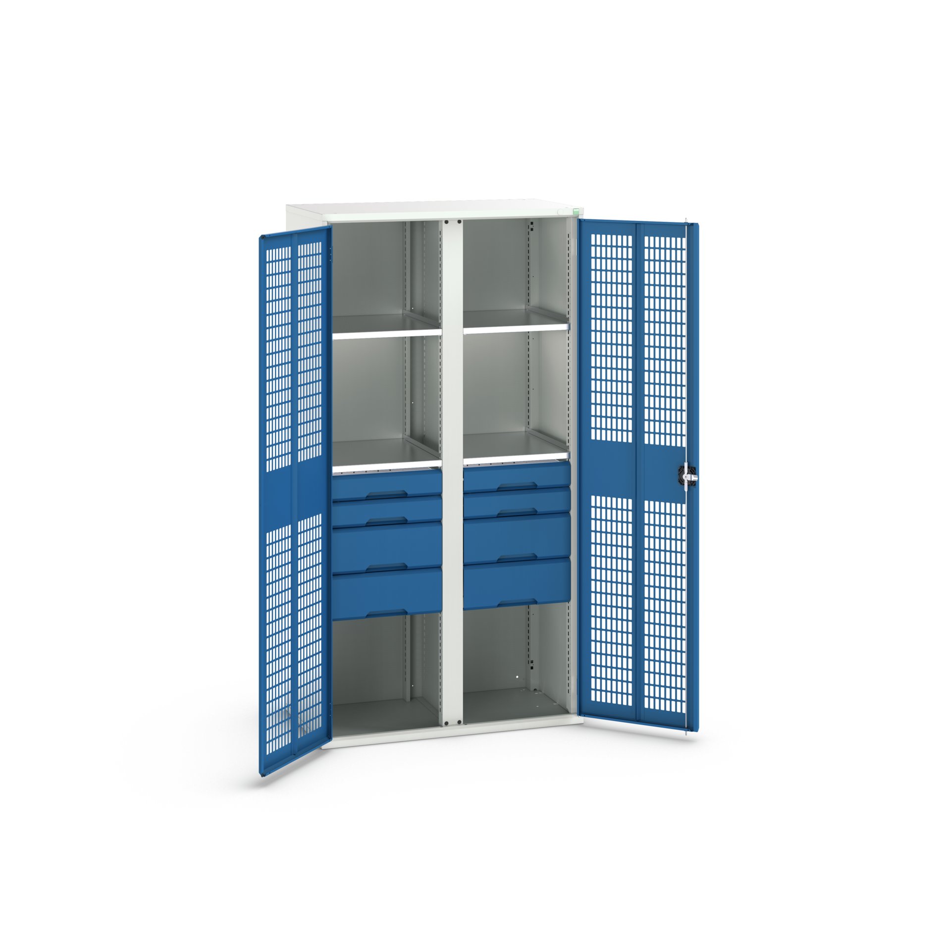 This is 2 Door 8 Drawer Sheet Steel Cupboard 1050 x 550 x 2000mm manufactured by Bott. The manufacturer part number is 16926778.11. It contains 2 dedicated doors . The given dimensions of the product include 1050 x 550 x 2000mm. The product is made from highly stable and reliable sheet steel. It contains 4 high quality shelves . It includes 8 high-quality drawers . It comes in kitted cupboard configuration.