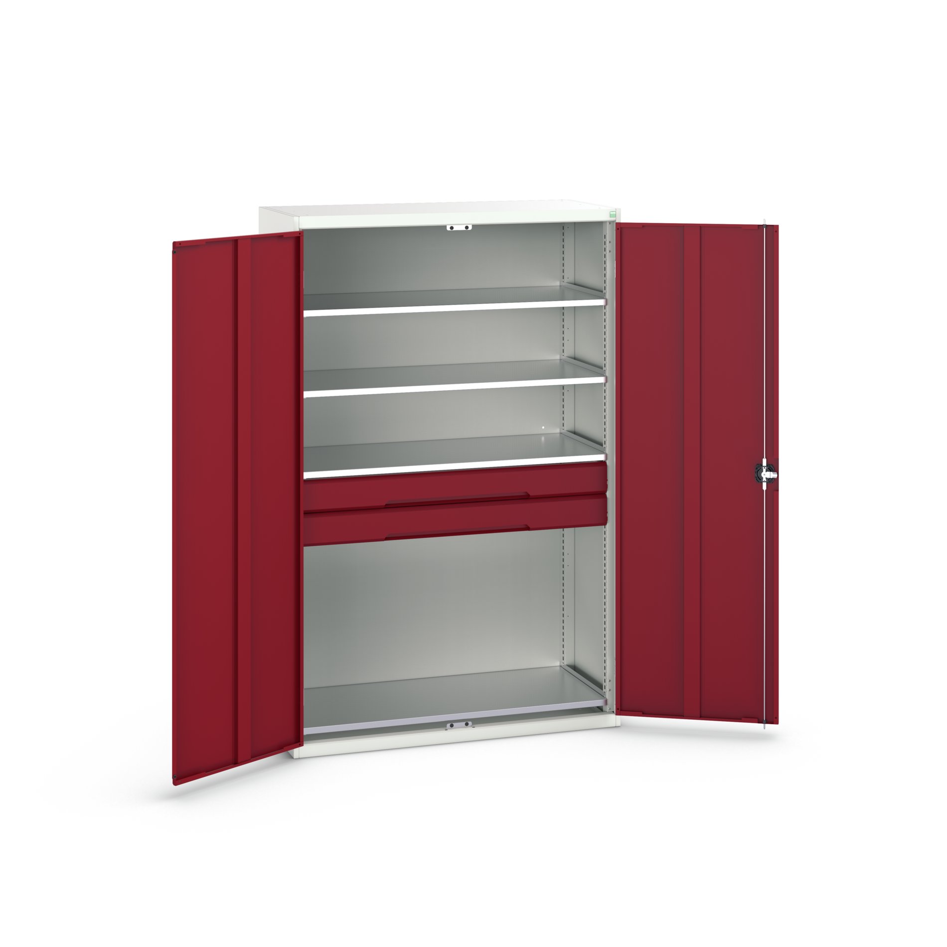 This is 2 Door 2 Drawer Sheet Steel Cupboard 1300 x 550 x 2000mm manufactured by Bott. The manufacturer part number is 16926654.24. It contains 2 dedicated doors . The given dimensions of the product include 1300 x 550 x 2000mm. The product is made from highly stable and reliable sheet steel. It contains 4 high quality shelves . It includes 2 high-quality drawers . It comes in kitted cupboard configuration.