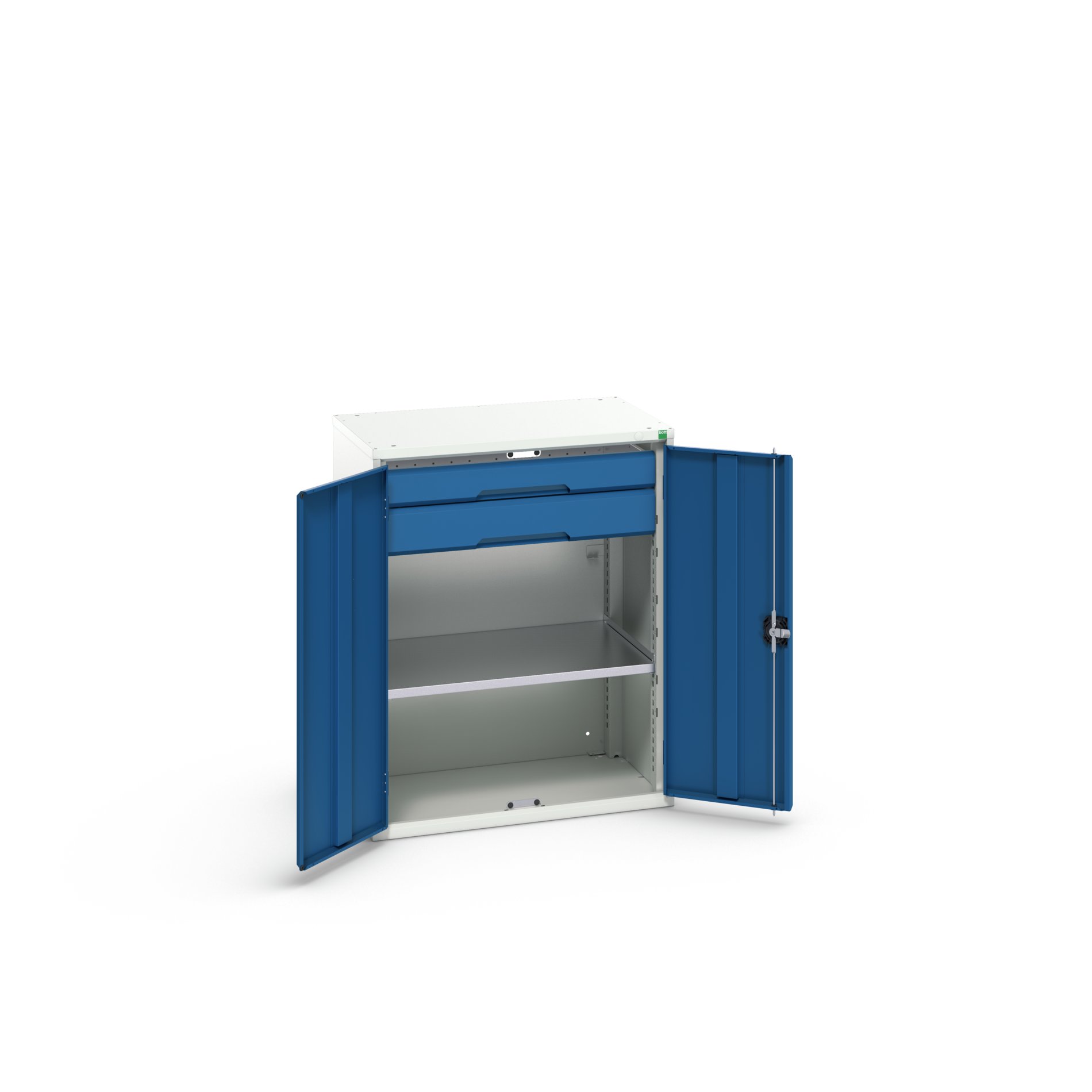 This is 2 Door 2 Drawer Sheet Steel Cupboard 800 x 550 x 1000mm manufactured by Bott. The manufacturer part number is 16926453.11. It contains 2 dedicated doors . The given dimensions of the product include 800 x 550 x 1000mm. The product is made from highly stable and reliable sheet steel. It contains 1 high quality shelves . It includes 2 high-quality drawers . It comes in kitted cupboard configuration.