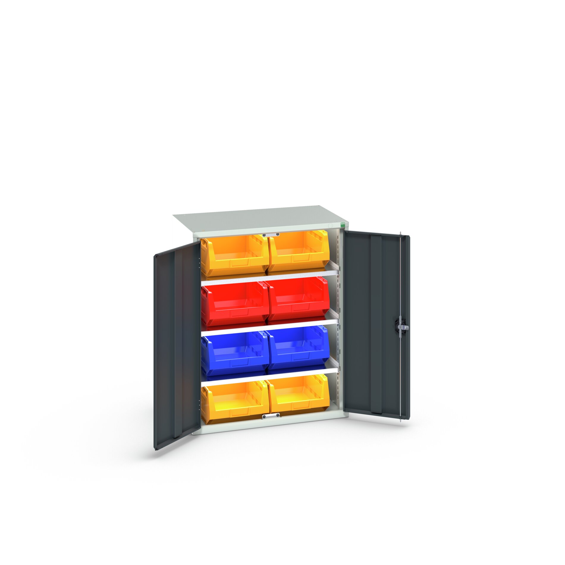 This is 2 Door Sheet Steel Cupboard 800 x 550 x 1000mm manufactured by Bott. The manufacturer part number is 16926450.19. It contains 2 dedicated doors . The product is made from highly stable and reliable sheet steel. It comes in shelf cupboard configuration. The given dimensions of the product include 800 x 550 x 1000mm. It contains 3 high quality shelves .