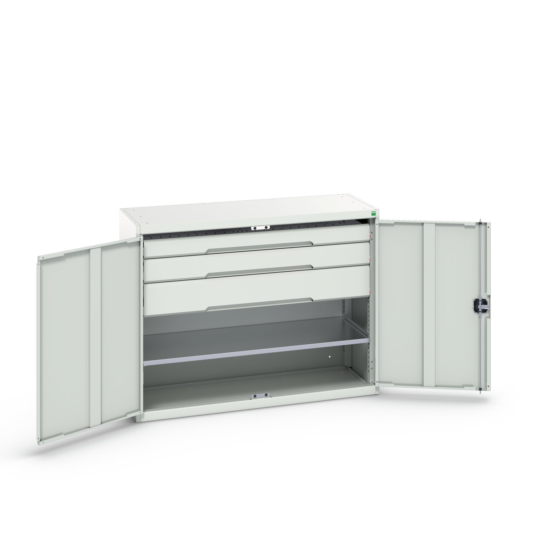 This is 2 Door 3 Drawer Sheet Steel Cupboard 1300 x 550 x 1000mm manufactured by Bott. The manufacturer part number is 16926607.16. It contains 2 dedicated doors . The given dimensions of the product include 1300 x 550 x 1000mm. The product is made from highly stable and reliable sheet steel. It contains 1 high quality shelves . It includes 3 high-quality drawers . It comes in kitted cupboard configuration.