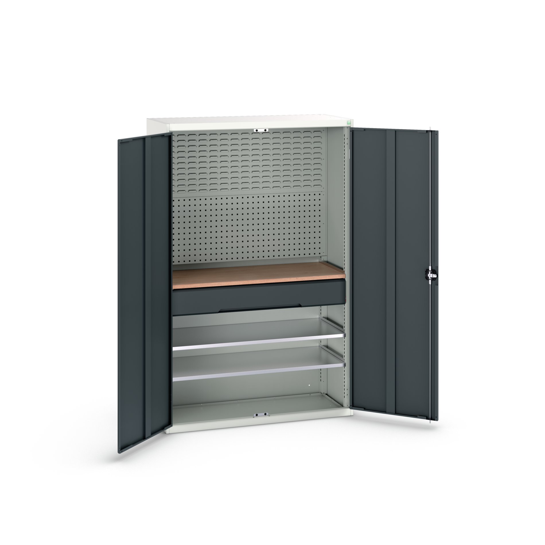 This is 2 Door 1 Drawer Sheet Steel Cupboard 1300 x 550 x 2000mm manufactured by Bott. The manufacturer part number is 16926592.19. It contains 2 dedicated doors . The given dimensions of the product include 1300 x 550 x 2000mm. The product is made from highly stable and reliable sheet steel. It contains 2 high quality shelves . It includes 1 high-quality drawers . It comes in kitted cupboard configuration.