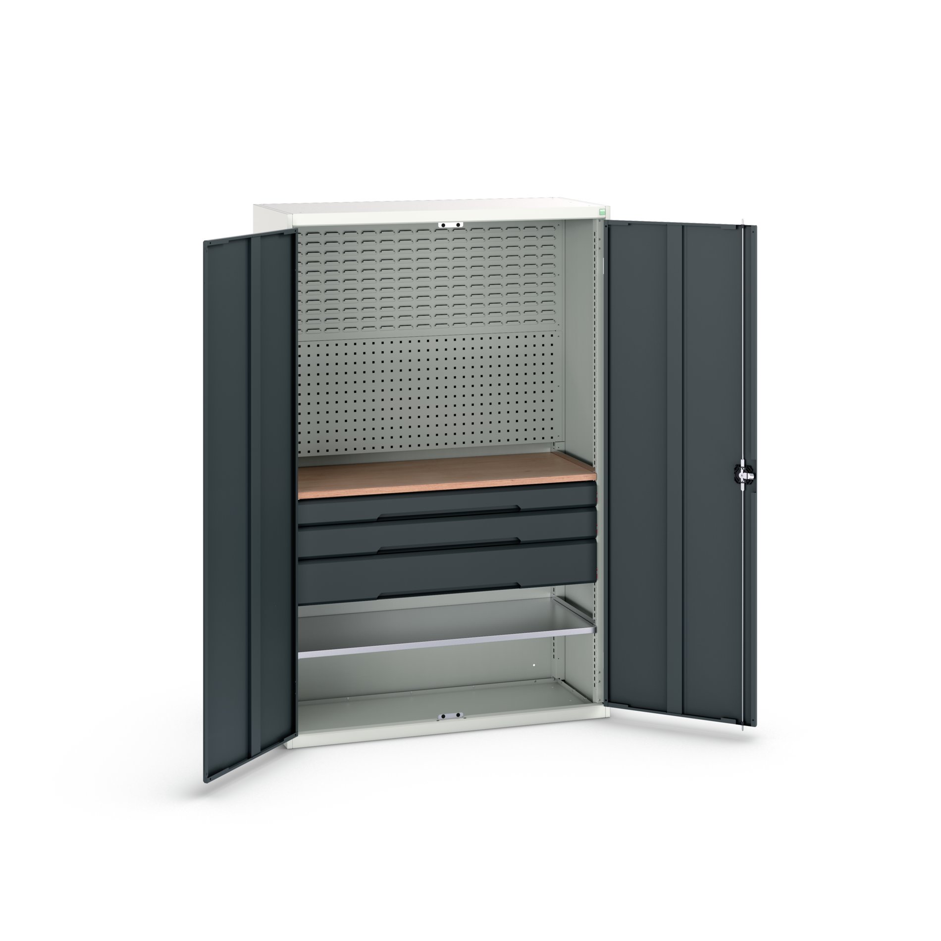 This is 2 Door 3 Drawer Sheet Steel Cupboard 1300 x 550 x 2000mm manufactured by Bott. The manufacturer part number is 16926594.19. It contains 2 dedicated doors . The given dimensions of the product include 1300 x 550 x 2000mm. The product is made from highly stable and reliable sheet steel. It contains 1 high quality shelves . It includes 3 high-quality drawers . It comes in kitted cupboard configuration.