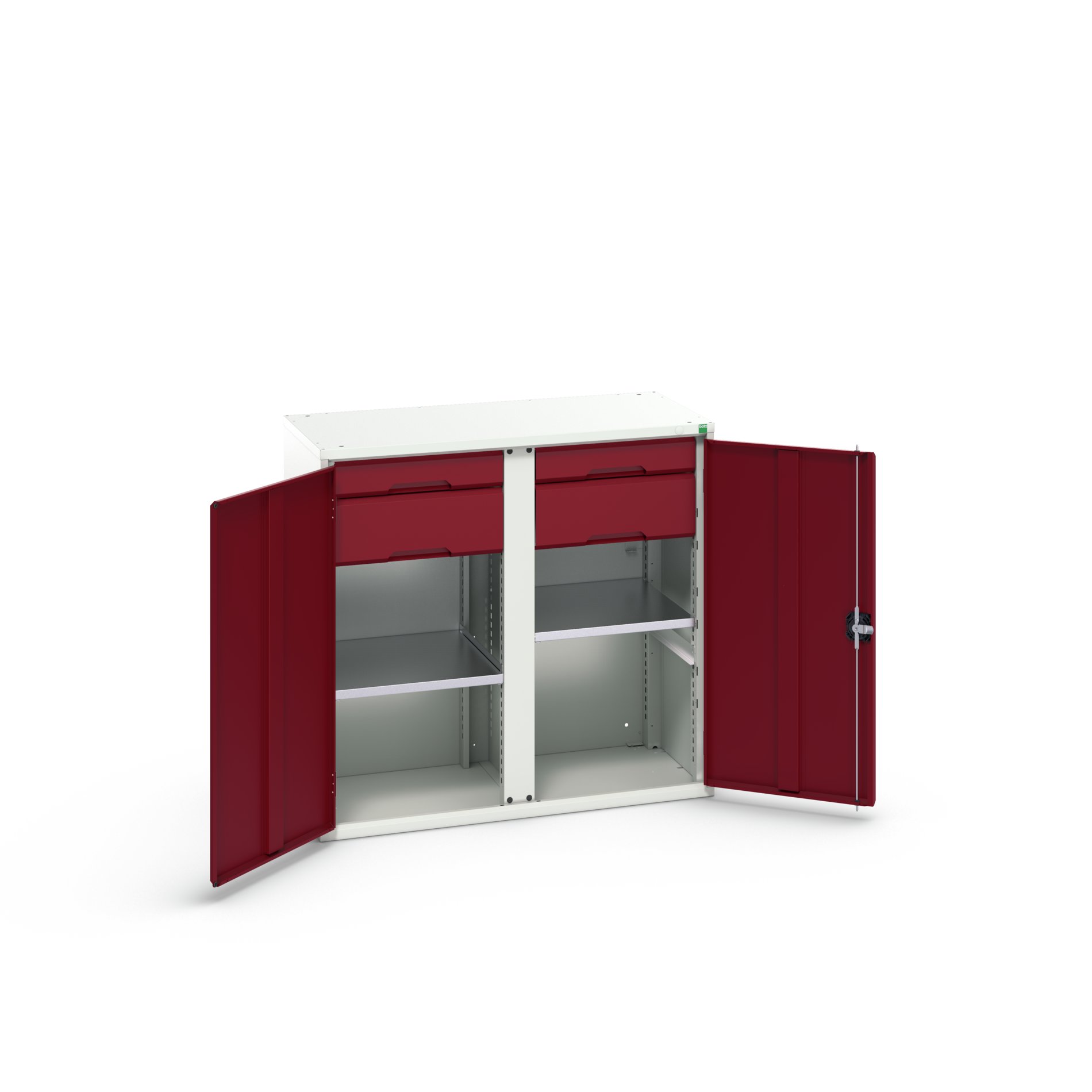 This is 2 Door 4 Drawer Sheet Steel Cupboard 1050 x 550 x 1000mm manufactured by Bott. The manufacturer part number is 16926556.24. It contains 2 dedicated doors . The given dimensions of the product include 1050 x 550 x 1000mm. The product is made from highly stable and reliable sheet steel. It contains 2 high quality shelves . It includes 4 high-quality drawers . It comes in kitted cupboard configuration.